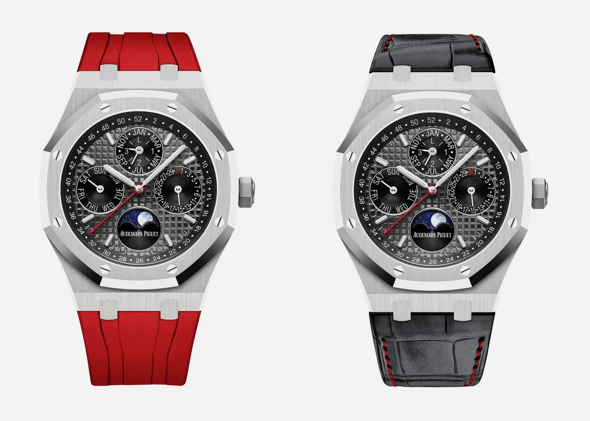 Приятным сюрпризом является комплект поставки изделия: помимо интегрального титанового браслета, неразрывно связанного с образом Royal Oak, он включает две полезные опции — серый ремень из кожи аллигатора и каучуковый ремешок красного цвета.