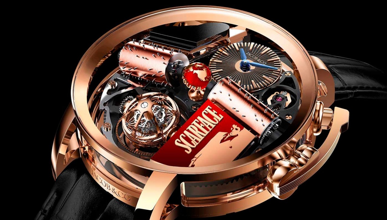 Компания Jacob & Co. пополнила линейку Opera новой моделью. На сей раз в часах с акустическим механизмом, сконструированным по принципу музыкальной шкатулки, звучит «Тема Тони» из криминальной драмы Брайана де Пальма «Лицо со шрамом». Постер с главным героем картины и названием фильма помещен на одну из гребенок, обеспечивающих работу музыкального механизма. Еще одна интересная деталь – глобус из розового золота с надписью «The World is Yours». Эта фраза стала слоганом картины, а также игры по мотивам фильма, выпущенной в 2006 году. Корпус модели 49 х 23 мм представлен в двух вариантах – в розовом золоте и титана с DLC-покрытием. Каждая из версий лимитирована серией 88 экземпляров.