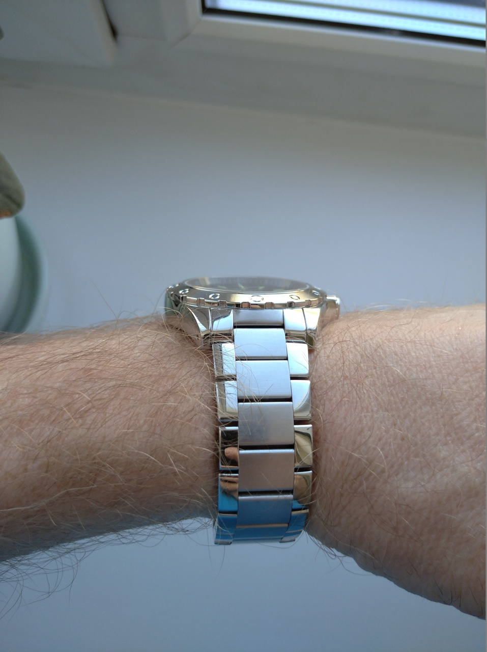 Браслет: сталь 22мм сатин плюс полировка, на 19,5 см максимум с раскладывающейся застежкой с двумя кнопками. Ремни менять очень легко, ибо ухи просверлены.