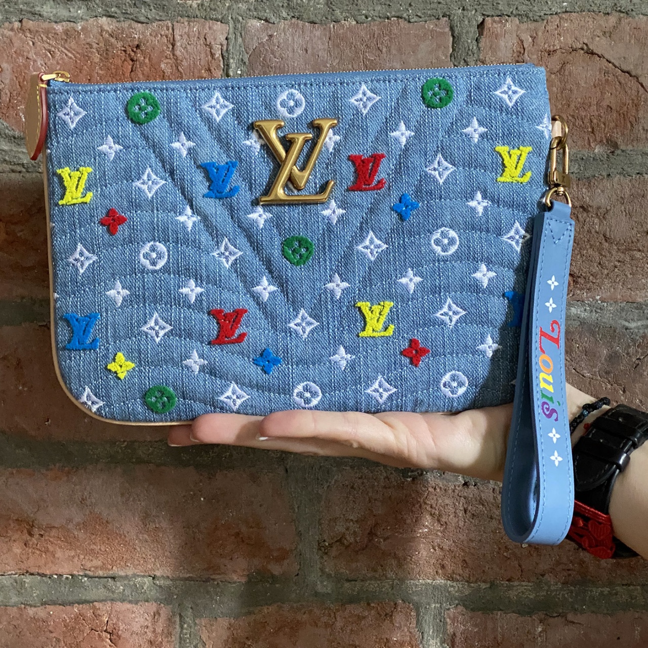 "Эффектный клатч New Wave, представленный в сезонной коллекции LV Denim, выполнен из денима модной винтажной обработки. Волнистые строчки, разноцветная вышивка узора Monogram и фурнитура из золотистого металла — выразительные элементы яркого дизайна. Удобная съёмная ручка украшена красочной подписью Louis Vuitton. Стильный аксессуар гармонично дополнит современный образ."