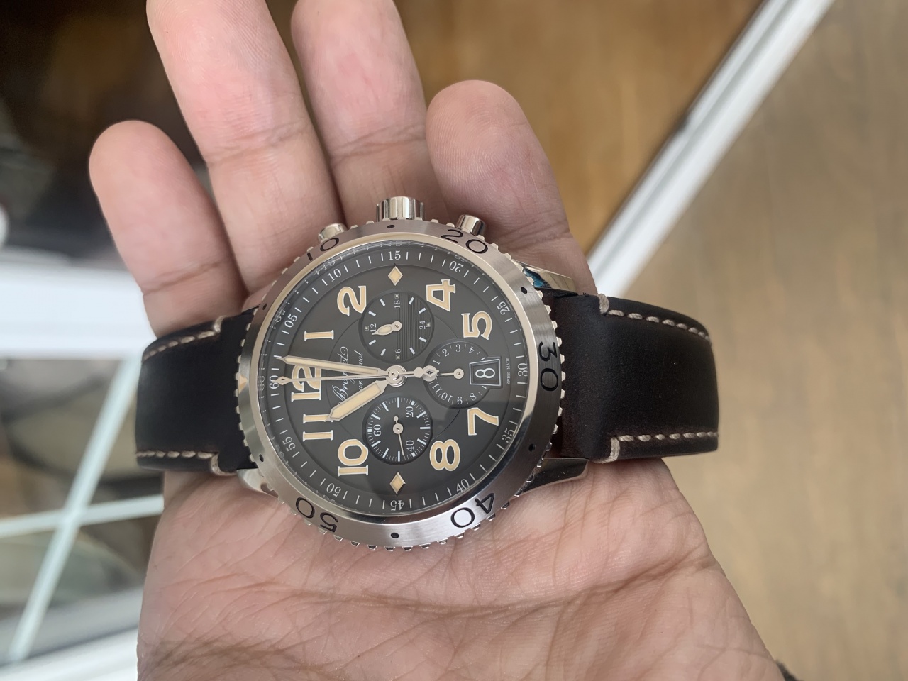 К продаже предлагаются часы Бреге Type XXI - на мой скромный вкус это самые красивые часы в этой линейке. Корпус 42 мм, fly-back хронограф лемания, графитово-серый цифер и темно коричневый ремень.