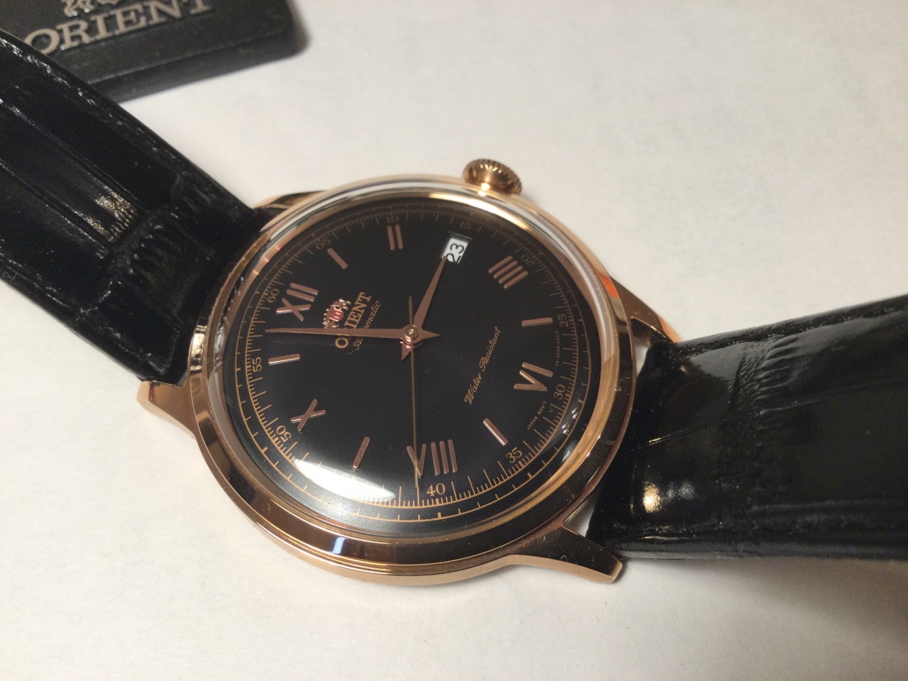 Orient Bambino версия 3 автоматический и ручной завод , полный комплект , часы не носились , только примерялись , из личной коллекции . Темно коричневый циферблат . Корпус , стрелки , часовые метки , надписи— цвет Розовое золото .