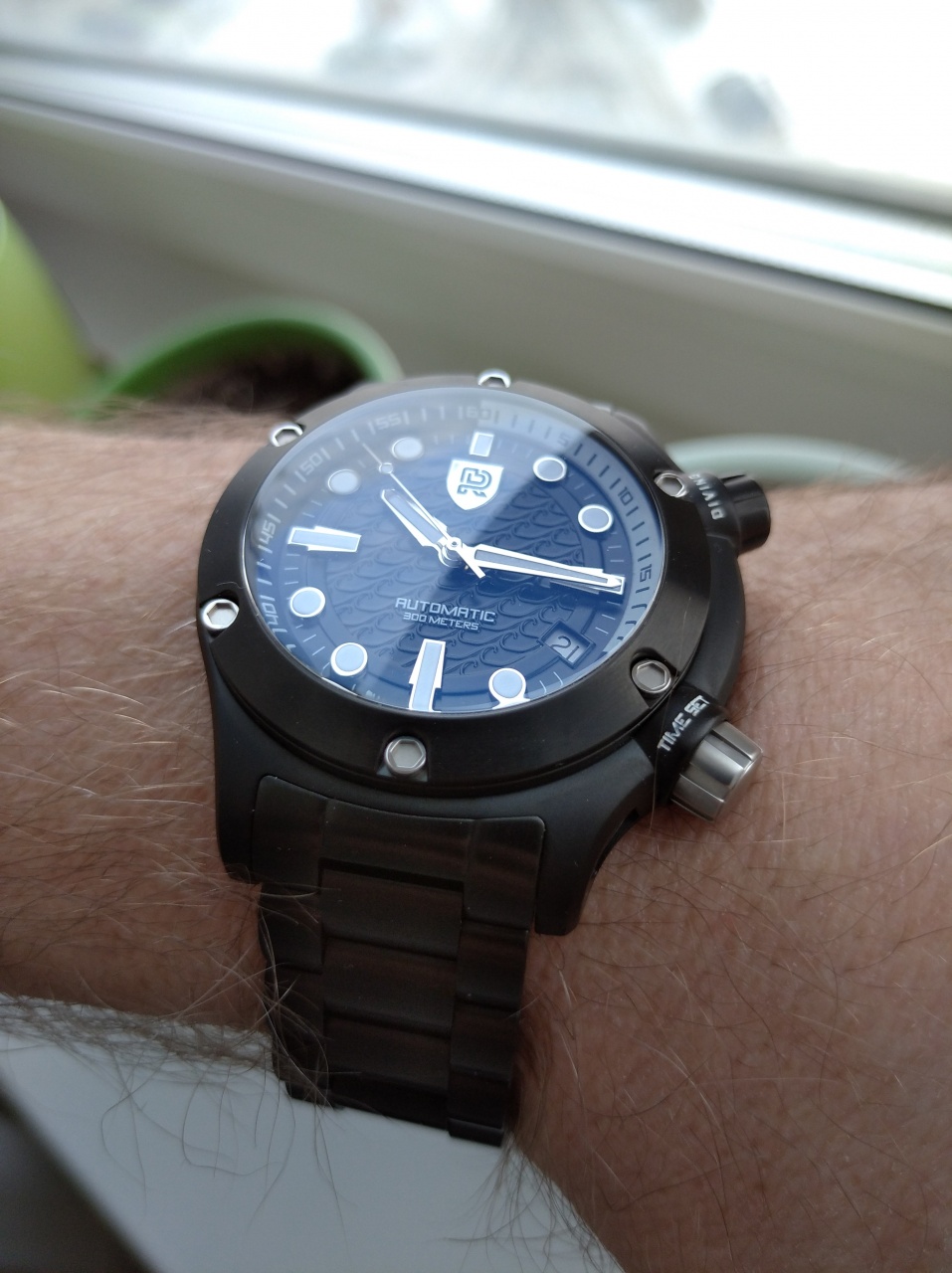 с 3D эффектом волн, очень красиво смотрится, накладные метки, дата на 4 часа, внутренний дайверский безель, управляемый головкой на 2 часа, ЗГ на 4 часа, обе головки завинчиваются.