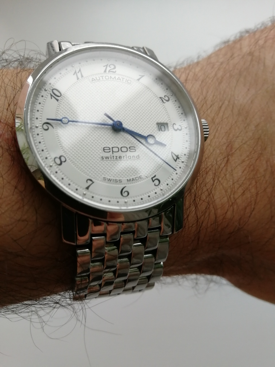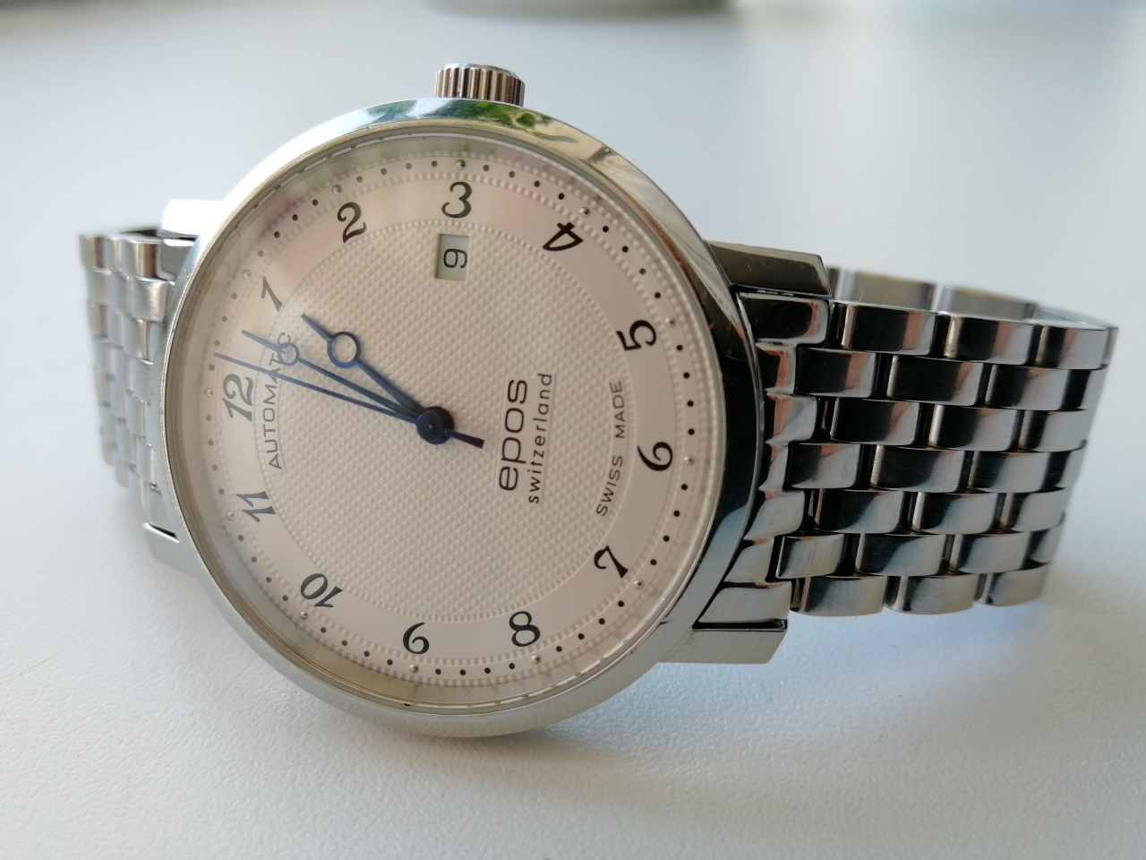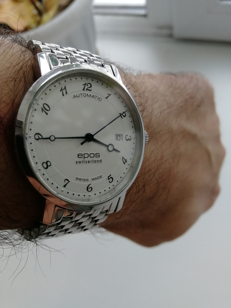 В продаже очень красивые часы от известного швейцарского бренда Epos. Довольно редкая модель, исполненная в духе классики от Breguet. Синеные стрелки, переливающиеся от ярко синего до черного цвета в зависимости от освещения, в сумме с потрясающим гильоше "парижские гвозди", светлым цифером и арабскими цифрами дают очень красивый, богато оформленный цифер. Под капотом ETA 2892, декорированный женевскими волнами. Отдельно хочется отметить качество браслета - он шикарен: очень плотный, тяжелый, каждое маленькое звено отдельно одето на шпильку и подвижно, в следствии чего получается идеальное облегание по руке. Часы 2017 года. Стекло в идеале. По корпусу и браслету мелкие следы естественной носки, несколько мелких забоинок, ничего критичного нет. Комплект полный: красивая деревянная коробка, документы. Браслет уменьшен под запястье около 17 см. Снятые 4 звена прилагаются.