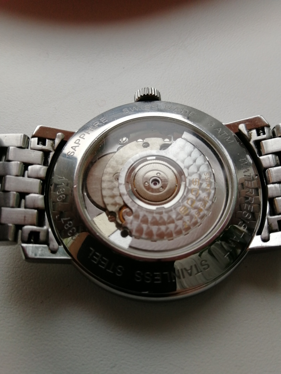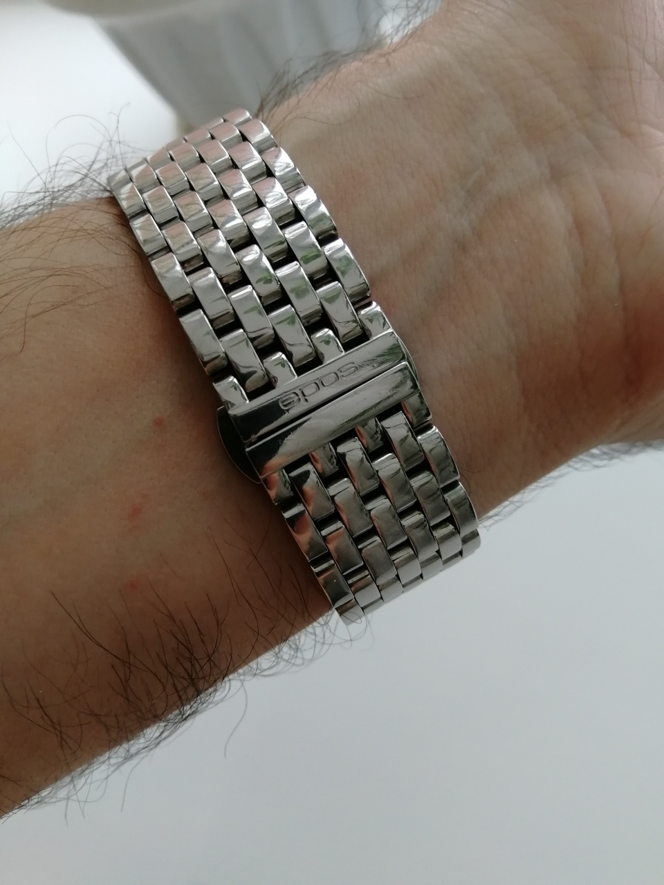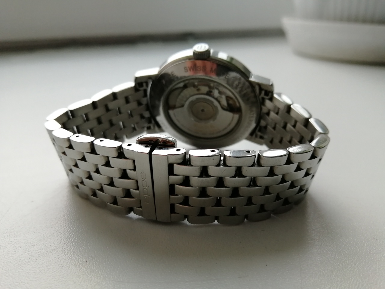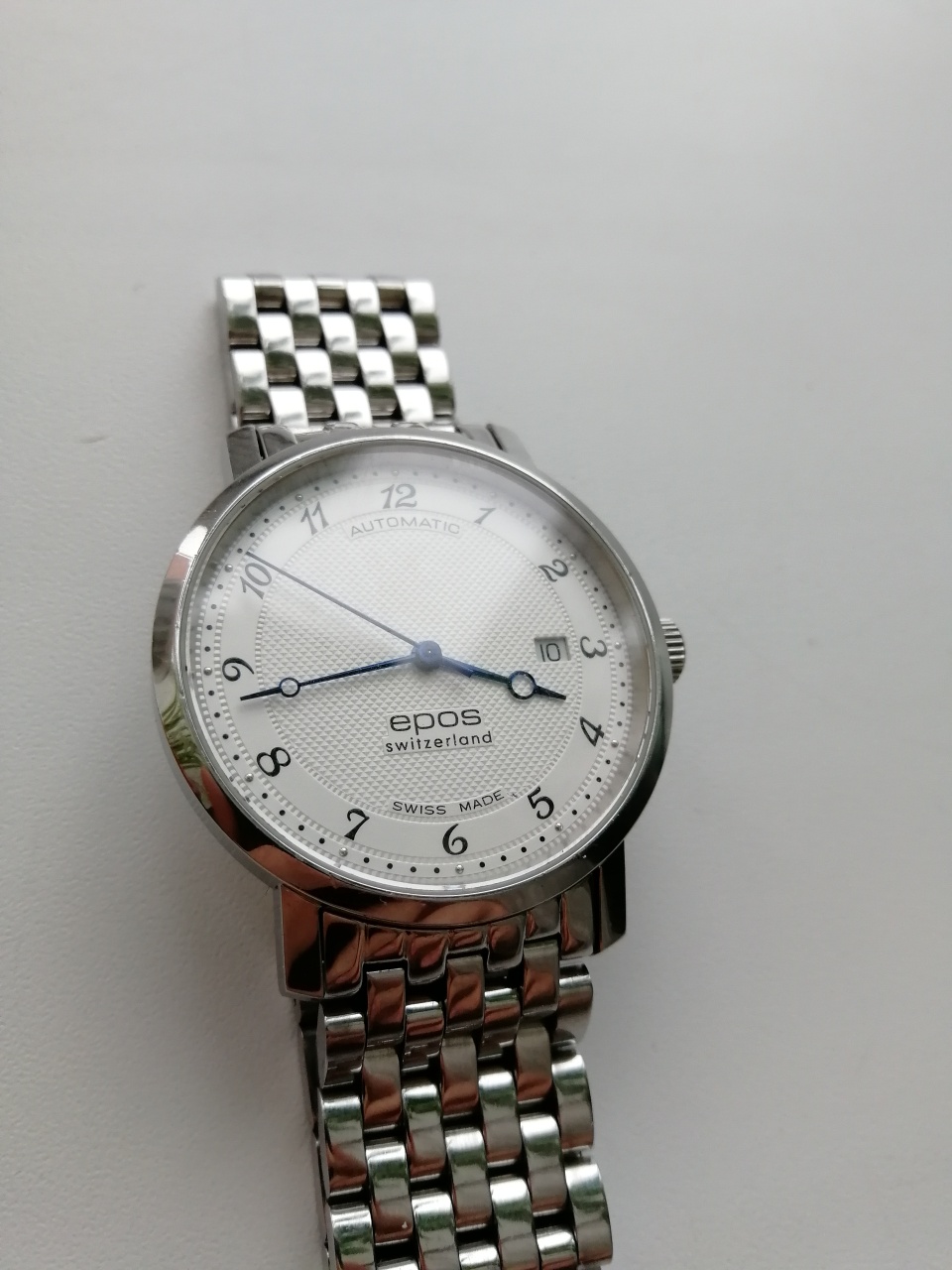 В продаже очень красивые часы от известного швейцарского бренда Epos. Довольно редкая модель, исполненная в духе классики от Breguet. Синеные стрелки, переливающиеся от ярко синего до черного цвета в зависимости от освещения, в сумме с потрясающим гильоше "парижские гвозди", светлым цифером и арабскими цифрами дают очень красивый, богато оформленный цифер. Под капотом ETA 2892, декорированный женевскими волнами. Отдельно хочется отметить качество браслета - он шикарен: очень плотный, тяжелый, каждое маленькое звено отдельно одето на шпильку и подвижно, в следствии чего получается идеальное облегание по руке. Часы 2017 года. Стекло в идеале. По корпусу и браслету мелкие следы естественной носки, несколько мелких забоинок, ничего критичного нет. Комплект полный: красивая деревянная коробка, документы. Браслет уменьшен под запястье около 17 см. Снятые 4 звена прилагаются.