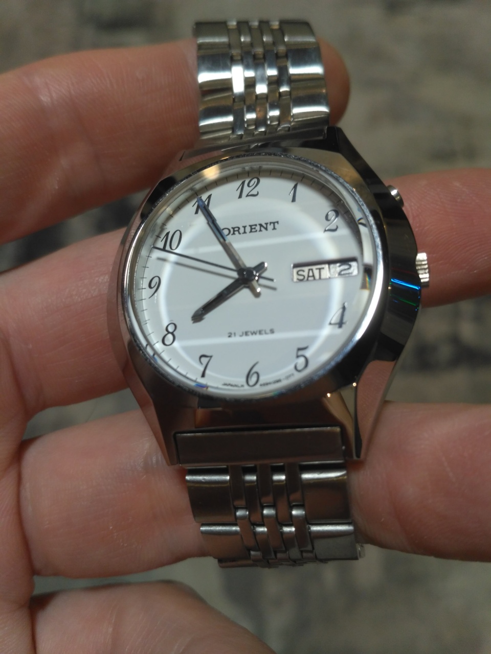 "От SS до SSS ... Настала новая эра корпусов часов Orient. Это потрясающе! Super Hard Stainless Steel 1000 Hv. SSS Удивительная новинка Представляем новый тип, в котором используются новые технологии, появившиеся на Orient, который один за другим выпускал популярные изделия. Этот корпус из нержавеющей стали, который был подвергнут специальной жесткой обработке (подана заявка на патент), имеет твердость 1000 + 50 Hv по сравнению с обычным корпусом из нержавеющей стали (твердость 200Hv). Устойчивый к царапинам, прочный и твердый SSS - это новаторский продукт, который выходит на рынок. Мексиканец SSS на 27камнях. Цена ¥ 24,000.'