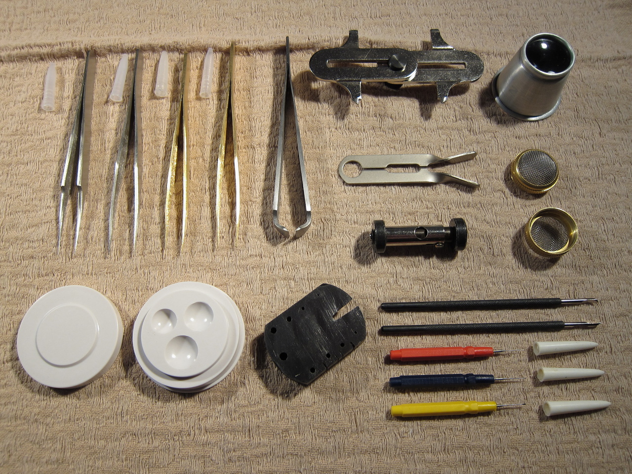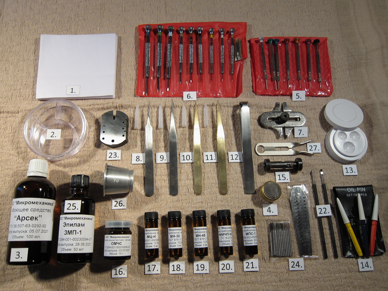 Разные часовые инструменты и расходники: пинцеты, масла, отвертки, лупа, эпилам, моющее средство для часовых механизмов “Арсек” и т.д.