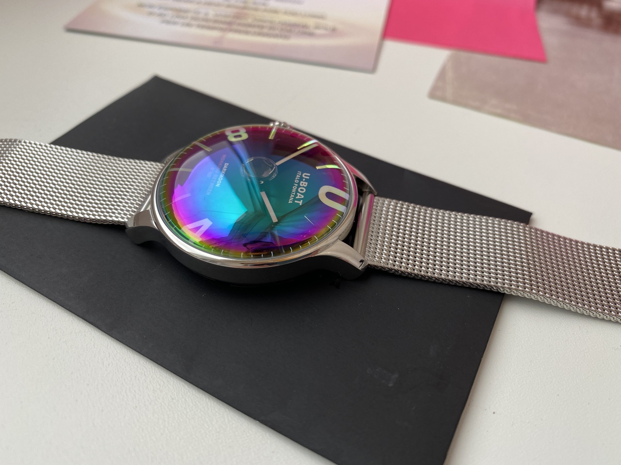 Для тех, кто готов к чему-то нестандартному - необычное купольное стекло в сочетании с "бензиновыми" переливами и меш-браслет миланского плетения выделяет часы из общей массы.