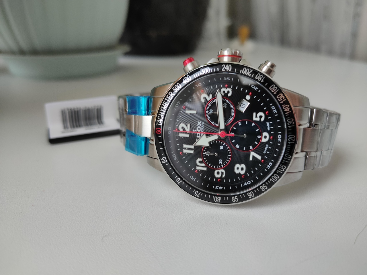 В продаже отличный крупный спорт-хронограф от уважаемого производителя. Очень интересная и качественно исполненная модель с вниманием к деталям. Цифер с накладными элементами и люмом на цифрах и стрелках, отличный плотный литой браслет с сочетанием полировки и практичного сатина. В целом имеем крепкий повседневник фактически без слабых сторон.