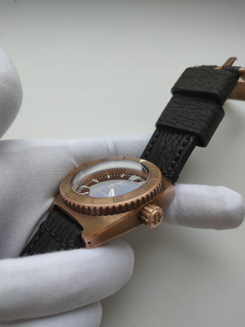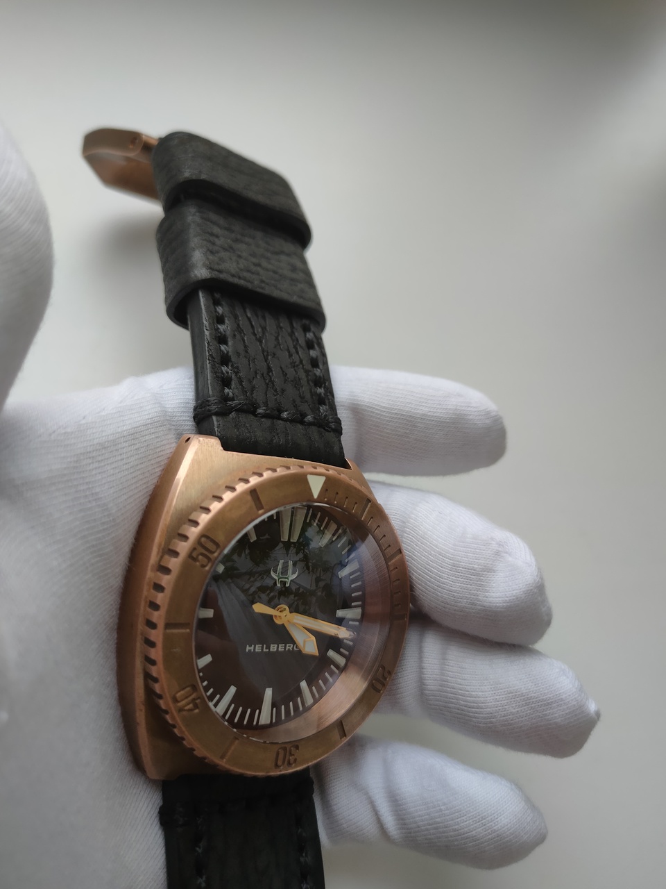 В продаже бронзовая мощь от немецкого производителя - H2O Helberg CH6. Лимитка уже давно распроданная на сайте производителя. В настоящий момент заказать такие часы в бронзовом корпусе невозможно. Модель на форуме известная и довольно популярная. На просторах много отзывов и обзоров про отличное качество исполнения, правильную красивую патину, шикарный купольный сапфир этих моделей. Скажу, что я тоже поддерживаю эти положительные отзывы- часы, правда, очень добротные и впечатления когда берешь их в руки очень даже на уровне