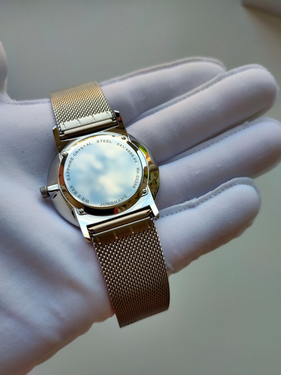 В продаже идеальный образец баухауса от уважаемого немецкого производителя с более чем 150-ти летней историей! В живую часы выглядят намного интереснее чем на фото и приятно удивляют. Отличный миланский браслет, интересный цвет цифера - в зависимости от освещения переливается от серо-болотного до коричнево-молочного. Секундная стрелка практически идеально попадает в метки. Отличный вариант приобрести небанальный кварц с классным дизайном. Из следов носки несколько малозаметных потертостей на застежке и микроцарапок на корпусе. В коробке есть пара потертостей на коже внутри коробки возле подушечки.