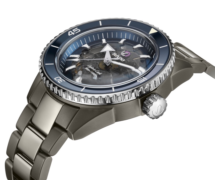 Впервые часы Captain Cook Ceramic представлены в корпусе диаметром 43мм. Модель, оснащенная корпусом и браслетом из плазменной высокотехнологичной керамики, вращающимся безелем из закаленной нержавеющей стали и вставками из высокотехнологичной керамики синего цвета и работает на основе механизма калибра Rado R734, отличающегося запасом хода 80 часов и водонепроницаемостью до 30 бар (300 м). Циферблат и задняя крышка корпуса искусно выполнены из тонированного сапфирового стекла черного цвета, обеспечивающего четкую видимость, а также возможность изучать и наблюдать за внутренней работой скелетонизированного механизма. Треугольник на безеле, а также деления и стрелки часов Captain Cook в виде меча покрыты Super-LumiNova® белого цвета, что позволяет проверять время даже в темное время суток. Великолепный сапфировый циферблат также украшен авторским знаком вращающегося якоря на 12-часовом делении и защищен еще одним сапфировым стеклом выпуклой формы.