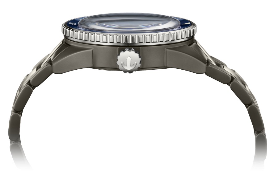 вращающийся безель из закаленной нержавеющей стали со вставкой из полированной высокотехнологичной керамики синего цвета и выгравированными цифрами, метками и треугольником с покрытием Super LumiNova® белого цвета