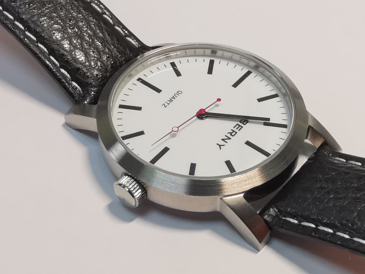 Циферблат глянцевый, белого цвета. Все надписи на циферблате, часовые и минутные метки, выполнены глянцевой краской черного цвета. Часовые метки простые вытянутые полосы, шириной, примерно 1,2мм. Минутные метки нанесены тонкими короткими штрихами между часовых меток по периметру циферблата. Есть надписи: BERNY и Quartz, выполненные простым рубленым шрифтом.