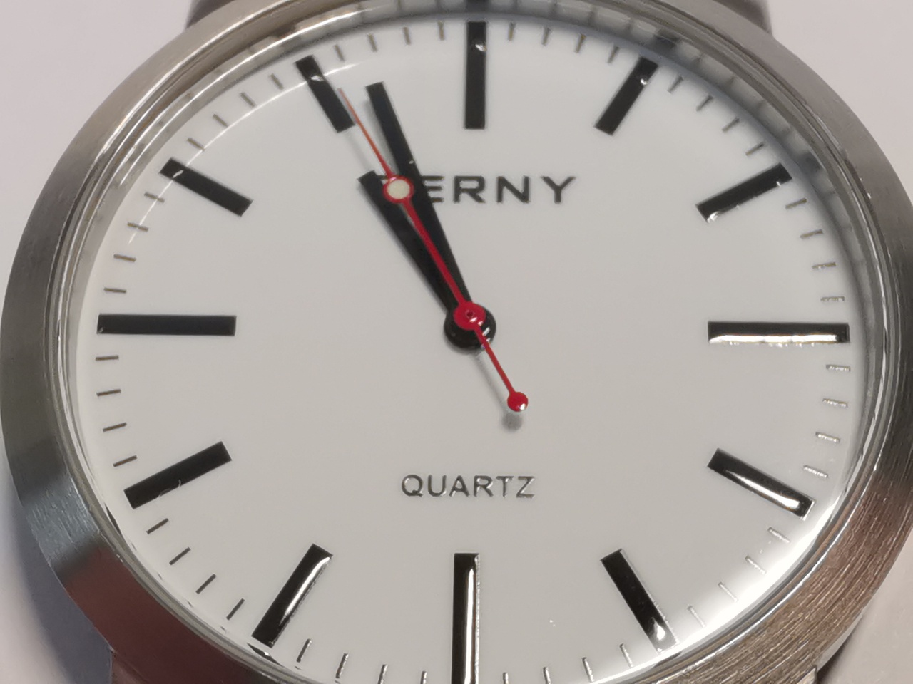 Стрелки в ширину часовых меток выполнены в той же стилистике,- простые полосы окрашенные черной глянцевой краской. Секундная стрелка красного цвета в виде тонкой указки с небольшим кружком на хвосте, и кружком наполненном люминофором в носовой части(одна треть от кончика стрелки).