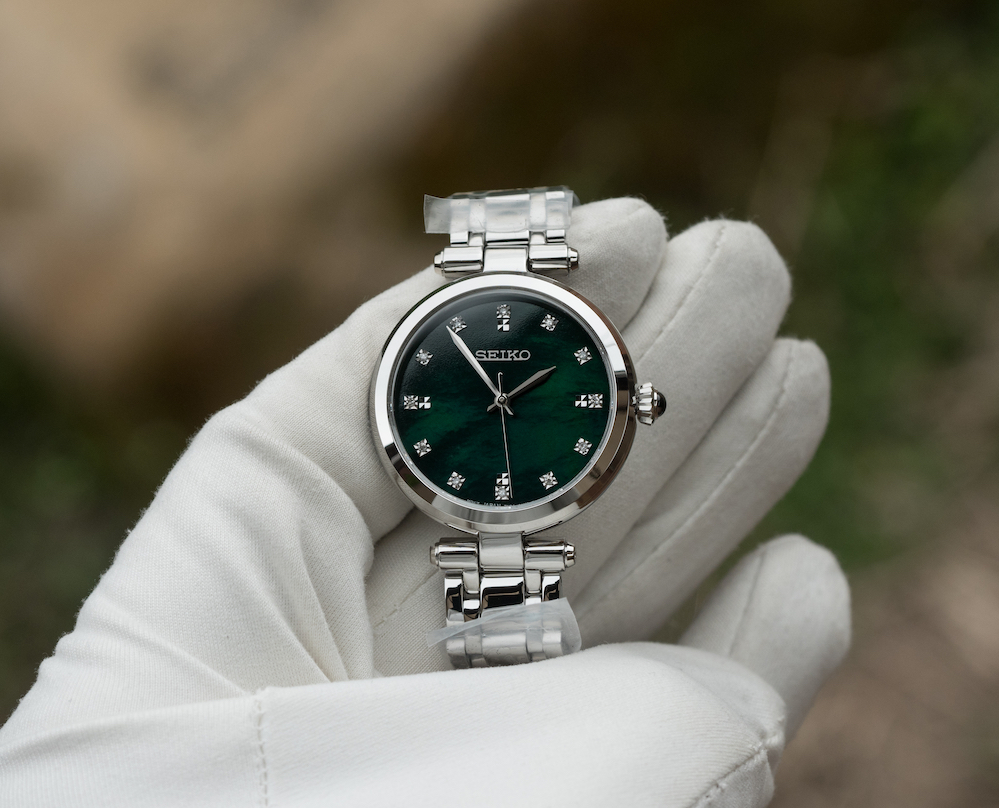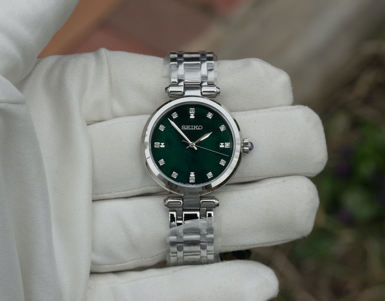 Очень красивая женская модель с зеленым циферблатом и бриллиантами на метках!