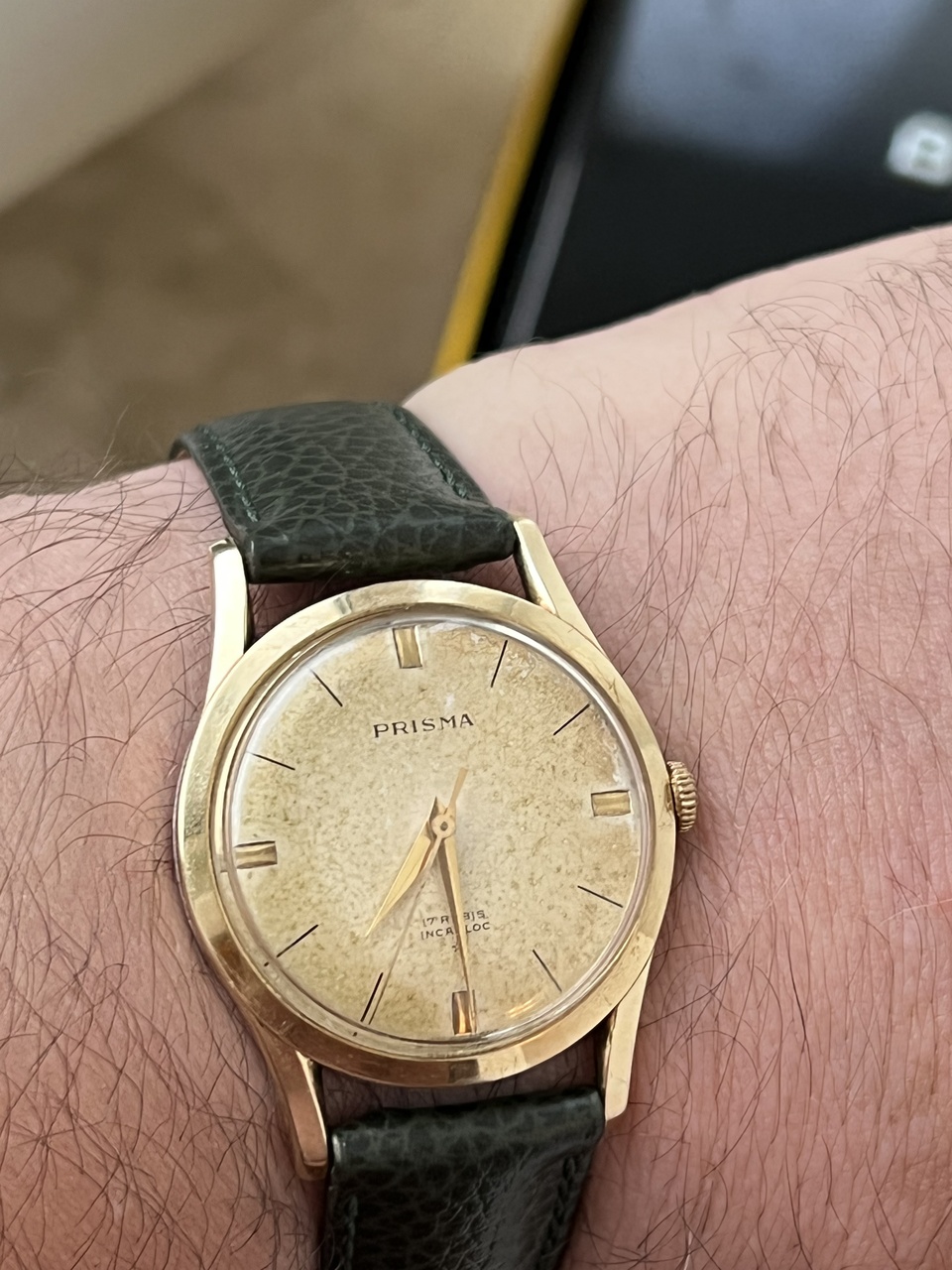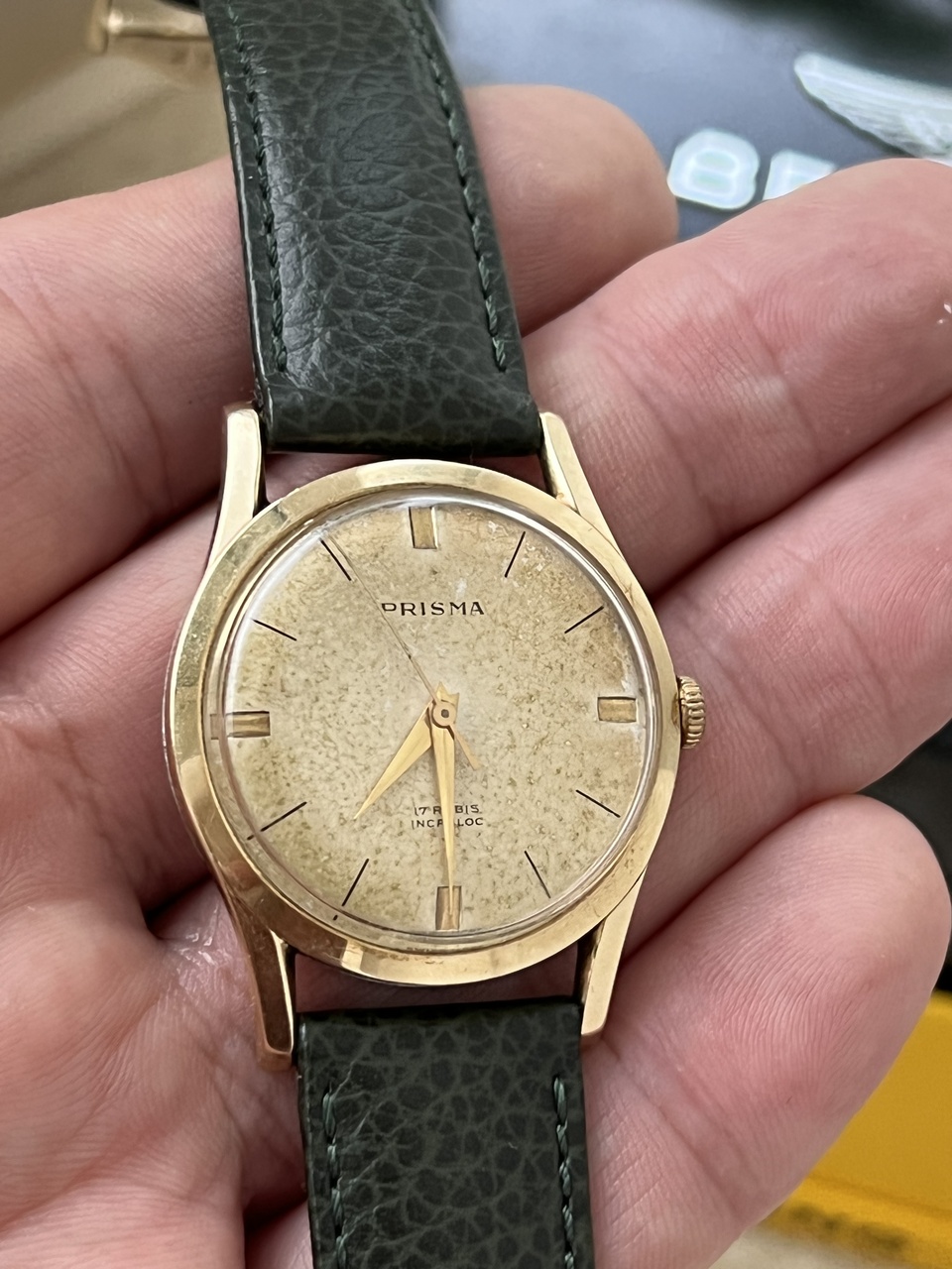 Продам винтажные часы Prisma, ручной завод. Красивейший циферблат с патиной. Диаметр 37,5 мм, ремень 18мм. Теперь интересное: эти часы я выставлял тут недавно, выставляю заново: дело в том, что на часах стоит проба 14, что соответсвует нашей пробе 583 золота. Все проверки в ювелирных, даже с соскобом внутри корпуса, показывают именно золото. Вес корпуса чистый 5,7 грамм. Но, так как тут возникли разногласия, я эти часы выставляю как позолоченные, а покупатель сам решит. Цена даже за позолоченные очень адекватная, красивый винтаж. Часы на точном ходу и обслужены. На руке смотрятся очень достойно!
