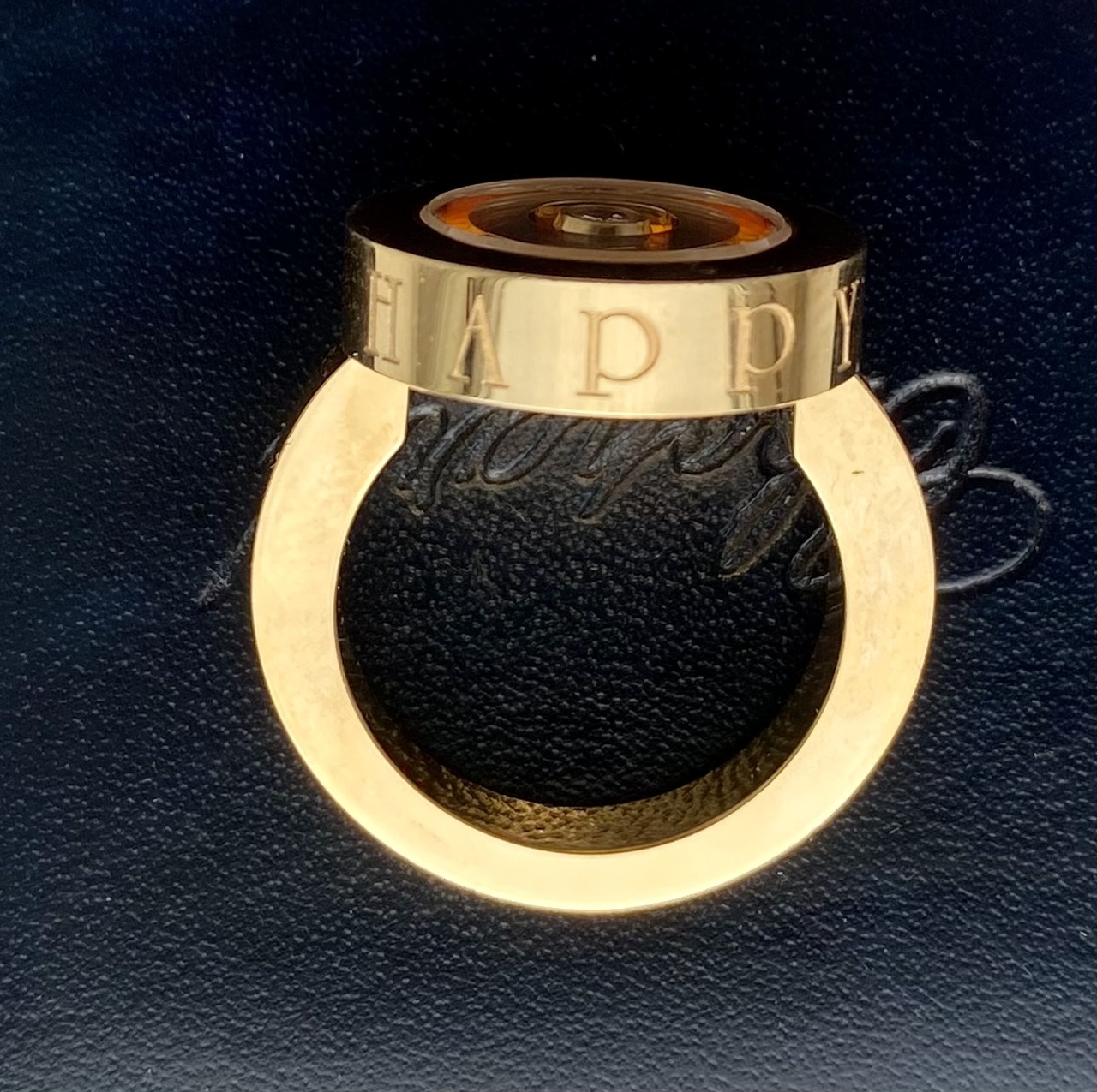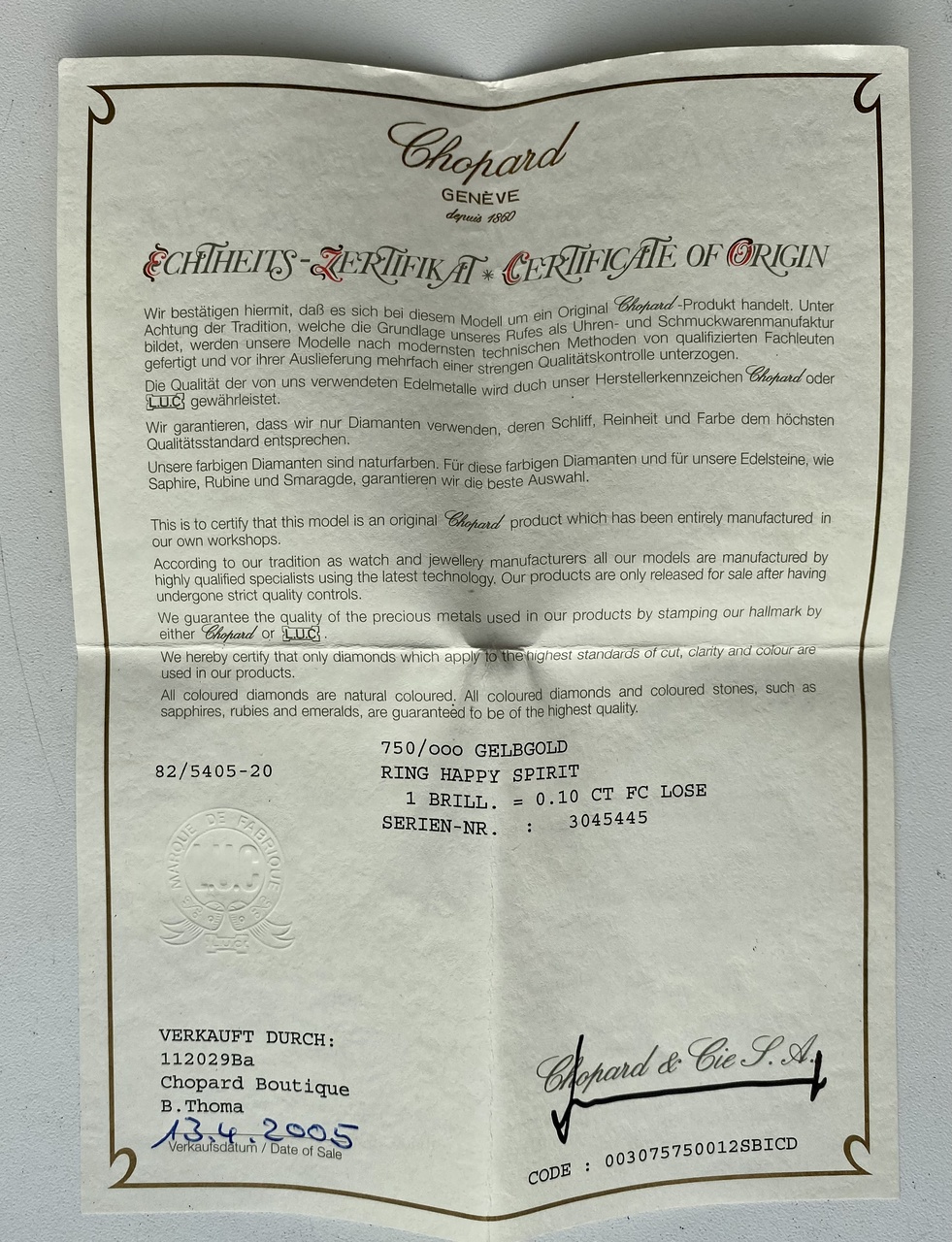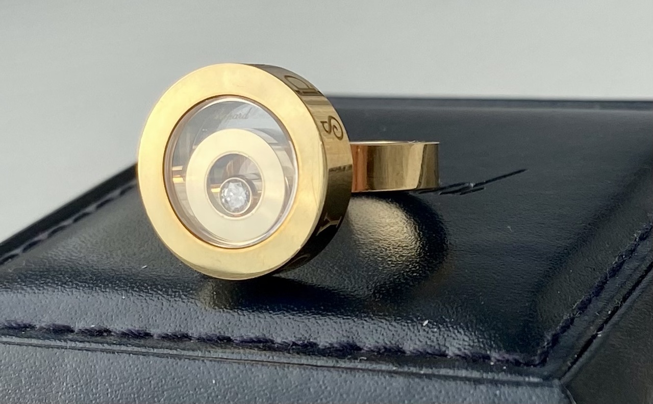 Кольцо Chopard коллекции "Happy Spirit”, выполненное из желтого золота 750 пробы с «плавающим» бриллиантом массой 0,10 ct. Вес - 17,5 гр. Диаметр верхушки - 17 мм.