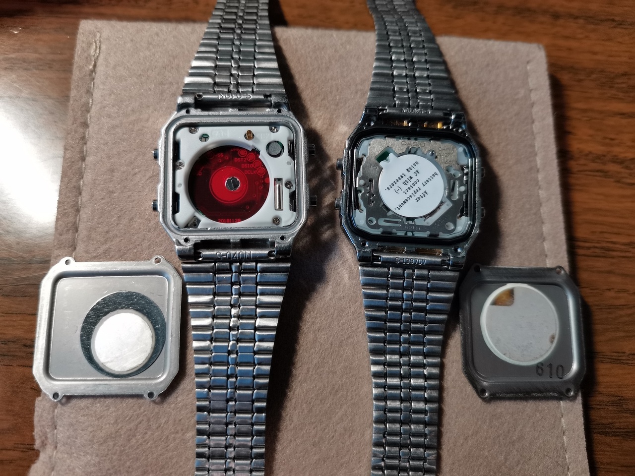 Передумал ставить модуль из Casio A500WE в это китайское Г. Во-первых расположение кнопок не совпадает (разница 2,6 мм). Во-вторых корпус Санда толще. В третьих механизм Касио чуть меньше ... на 1 мм. Ну и в целом не хочется портить хорошие часы Касио чтобы реанимировать безродное китайское Г.