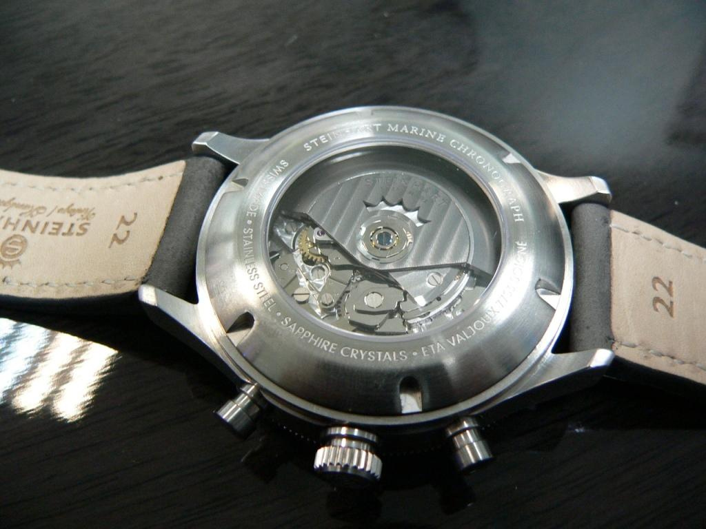 С обратной стороны через прозрачную крышку (тоже сапфир) можно наблюдать трудягу 7753 в топовой отделке с фирменным штайновским ротором цвета «мокрый асфальт», декорированным "женевскими волнами"(ротор, ротор декорирован).