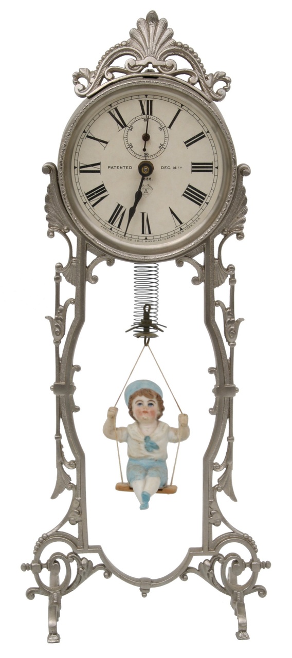 Описанные Вами часы похожи на изделия американской компании Ansonia Clock Co., модель 1890-х годов, называющаяся "Jumper". Фигурки могли быть разными. Поищите поиском в интернете "Ansonia Clock Jumper".