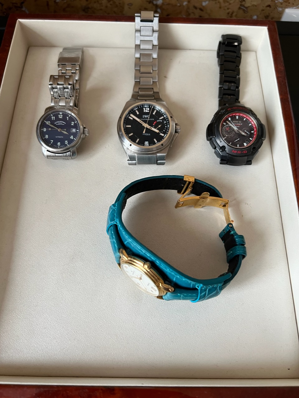 В прошлом году отчитался об окончании многолетней распродажи сета и единственном оставшемся Инженере, но когда долго чем-либо увлекаешься, обрастаешь массой вещиц из хобби, о которых попросту забываешь. Так, для начала нашел в шкафу давно забытые Muhle. Потом внезапно захотелось поносить оставшиеся от отца ML, которые я же и дарил ему 30 лет назад… Соответственно, обслужил, заказал ремень и клипсу, то есть с удовольствием сделал ровно те вещи которые меня так утомляли, когда сет был из 16 часов ) остались еще непроданные пока G-Shock MRG. Весь мой нынешний личный сет на фото