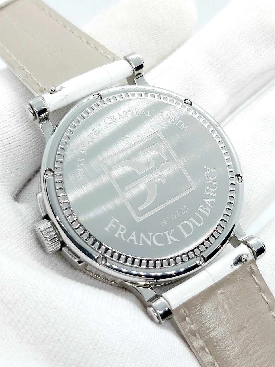 Под отметкой 12ти часов расположен шильдик с логотипом бренда, а под ним название марки Franck Dubarry.