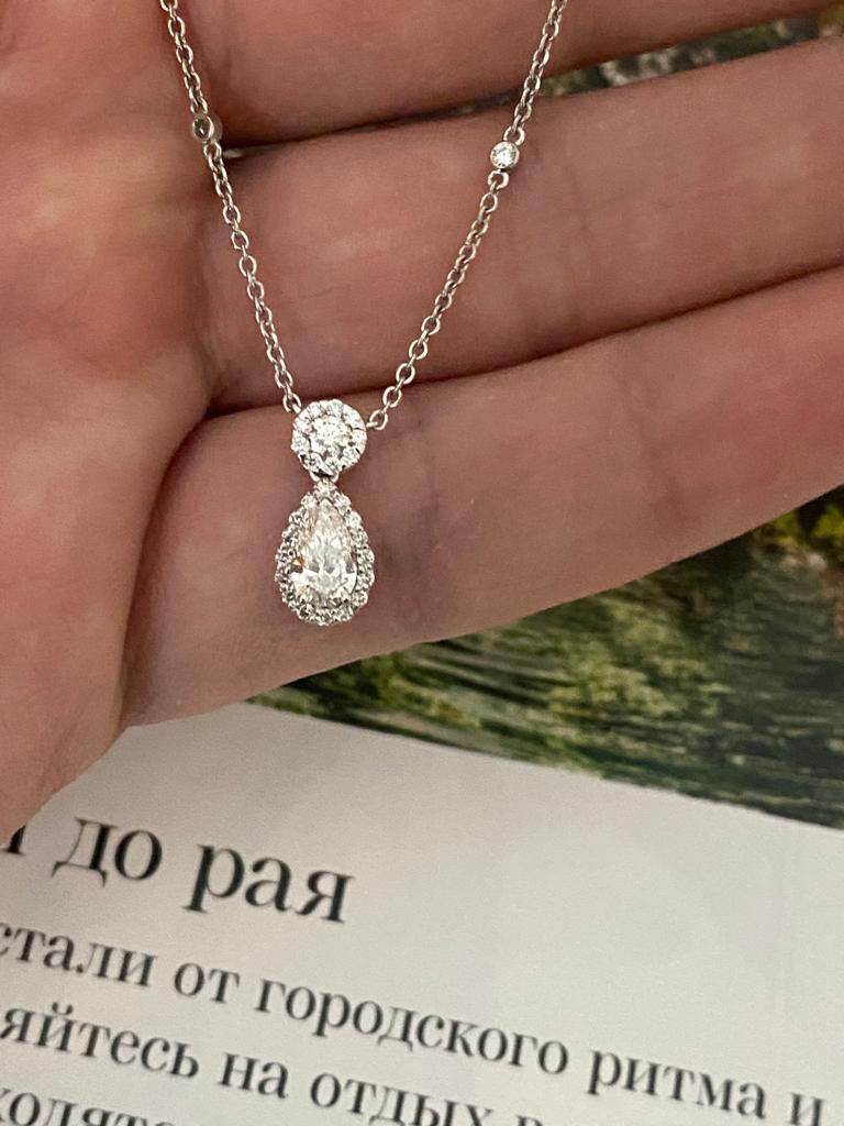 В продаже кулон-колье с бриллиантом огранки "Груша" 0,51 карат (сертификат GIA) и круглыми бесцветными бриллиантом.