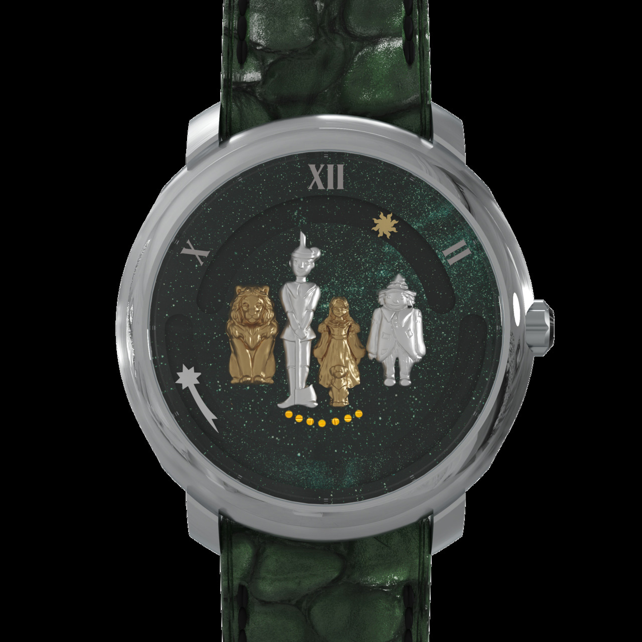 А ещё можно секундную срелка сделать желтой как дорога из желтого кирпича и она просто будет безать по кругу желтой полоской. Или можно сделать внутренний круг секундной стрелки с периодическими желтыми (под золото) участками. И сделать прорезь (или ряд отверстий) под ногами героев. Фигурки для этого чуть поднять вверх.