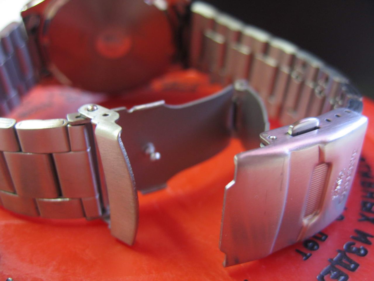 Шириной в 20 мм, имеет 16 прессованных звеньев. Полностью матовый, причем внутренняя и внешняя обработка отличается. Внешняя более приятная. Замок на двух скобах, с кнопками, и предохранительной скобкой. На замке имеется логотип компании ORIENT, а на скобах изнутри написано Titanium. В браслете имеется 8 регулировочных звеньев. Браслет крепится к корпусу обычными подпружиненными втулками. Внутренний диаметр браслета с корпусом примерно 210 мм.