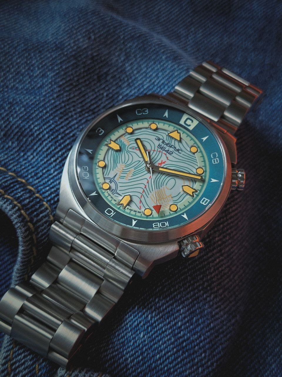 Внутренний безель, стилизован под компас со сторонами света, метки направления которого покрыты швейцарской Super-LumiNova (в темноте светятся зелёным цветом), в движение приводится с помощью зубчатой передачи верхней заводной головкой. Так же нужно отметить, что цветовая гамма выбрана не случайно. Глубокий бирюзовый цвет безеля символизирует собой цвет озер Приэльбрусья. В темное время суток, центральная окружность циферблата светится голубым цветом. С внешней стороны циферблат обрамляет окружность светящаяся зеленым
