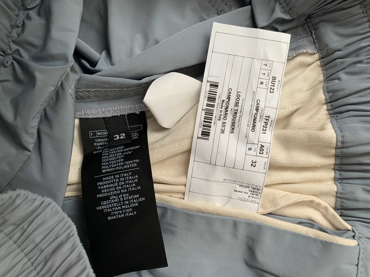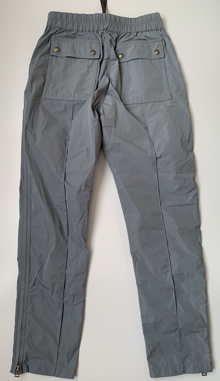 Брюки изготовлены из быстросохнущей нейлоновой ткани,что позволяет не сковывать движения при ходьбе и занятиях спортом.Пояс с резинкой регулируется с помощью шнурка,внизу брючин металические молнии с крупным брендированным бегунком.Боковые,прорезные карманы спереди,накладные карманы сзади имеют застёжку на пуговицы-клёпки с логотипом дизайнера.