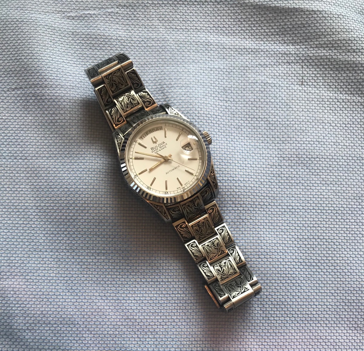 Предлагаю к продаже уникальные часы из своей коллекции - механические Bulova Super Seville Day Date 36мм. Как можно заметить, часы кастомизированны - браслет и корпус часов украшены узорной резьбой. Вживую часы невероятно красивы и привлекают внимание. Фото, к сожалению, не передает всей красоты (сделаны на старенький айфон). Часы в отличном состоянии для своего возраста. Материал-нержавейка, стекло-сапфир, циклоп, день/дата. Роскошный рифлёный безель ловит все лучики света своими гранями. Браслет максимально рассчитан на руку 22см. На данный момент укорочен на руку 17см. (звенья сохранены). Продаю в связи с новой хотелкой. Уверен, эти винтажные часы станут жемчужиной в любой коллекции.