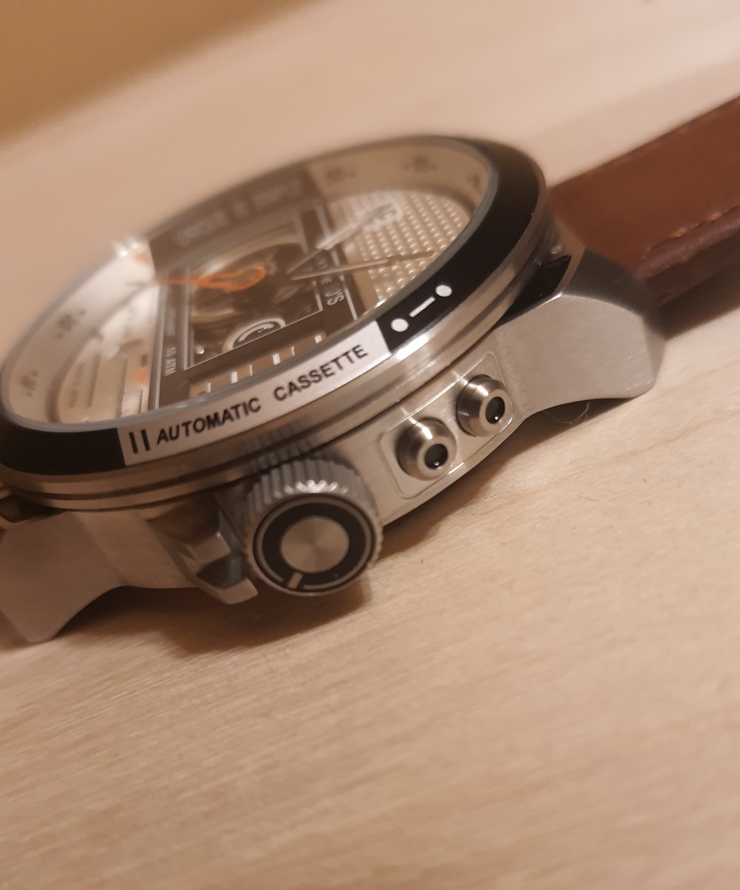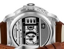 Основная фишка часов - их дизайн. Циферблат серебристый (хоть и кажется белым), изображает магнитофон с аудио-кассетой. При этом одна из кассетных катушек представляет собой окошко, через которое видна спираль баланса, создающая ощущение работающего мафона.