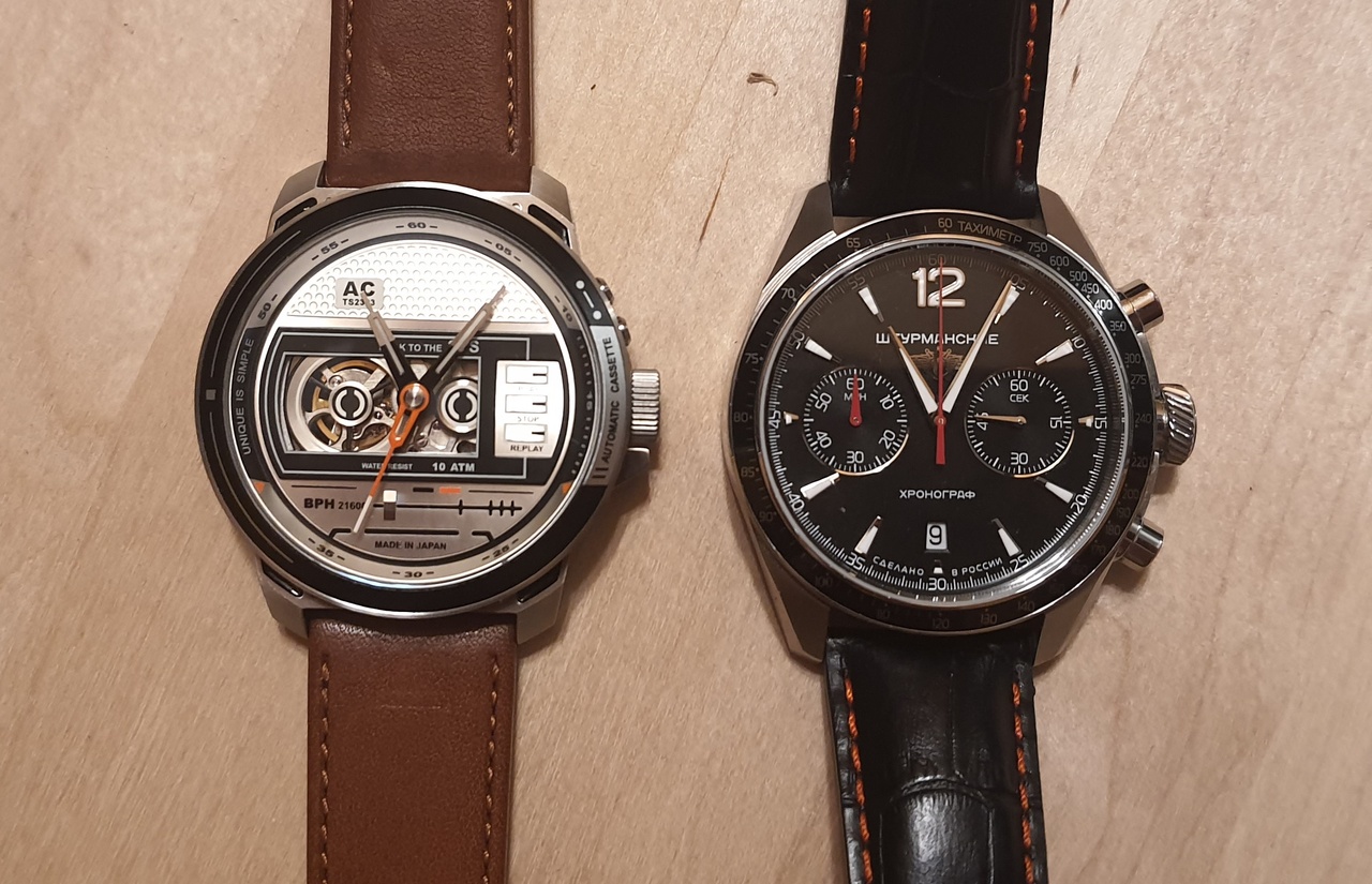 Габариты довольно внушительные: диаметр корпуса 45 мм. Однако это немного компенсируется скромными ушками (общая длина 5,5 мм), из-за чего на руке кажутся меньше, чем похожие по габаритам Штурманские.