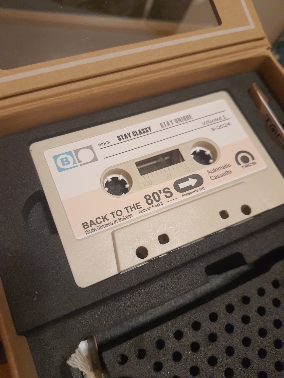 Коробка простая картонная. Кроме, собственно, часов, комплектуется визиткой с Qr-ссылкой на мануал, а также настоящей аудио-кассетой. (на ней вроде что-то записано, но послушать нынче не на чем)