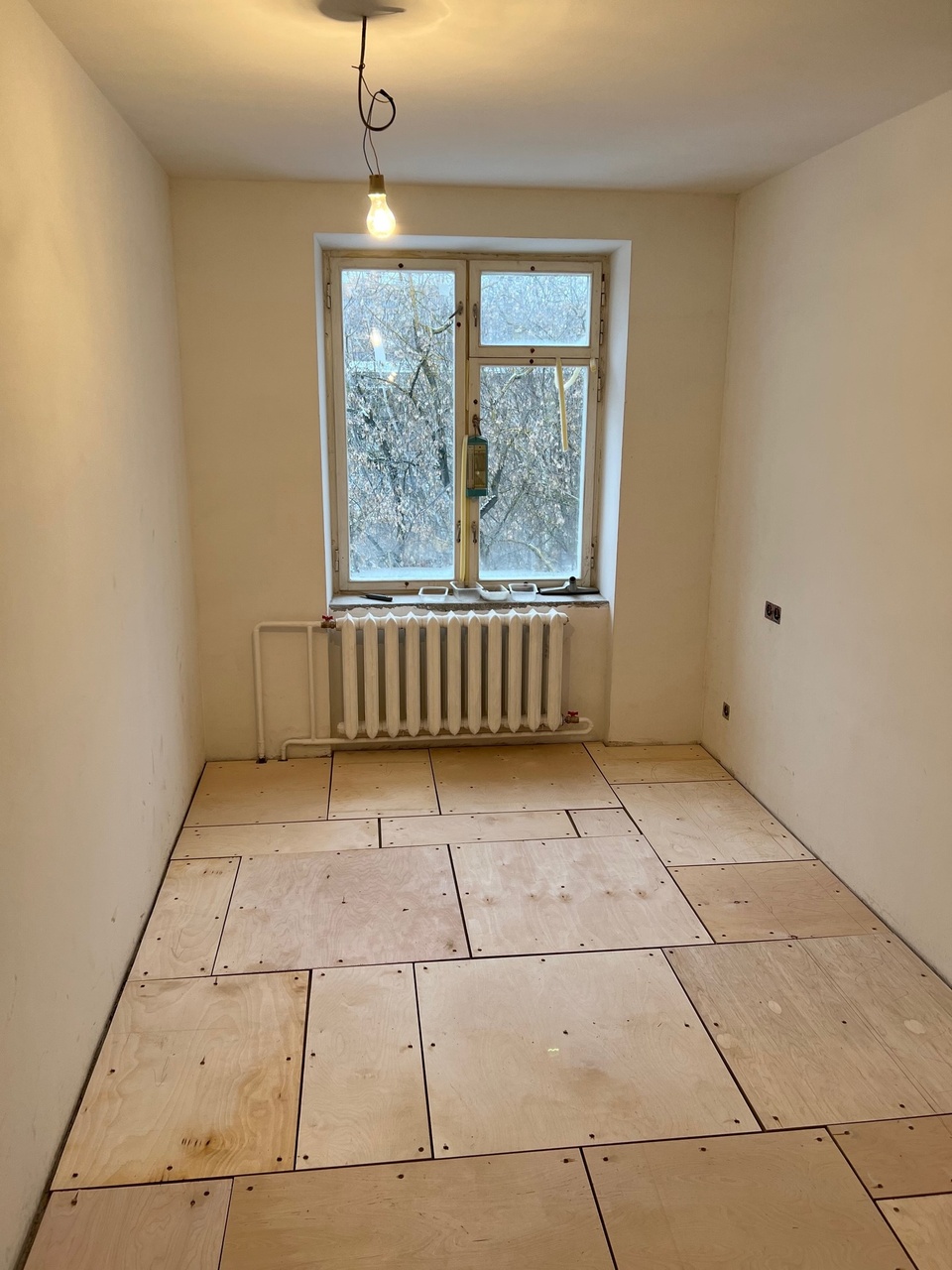 Уложили паркет. Покрыли лаком полуматовым, накрыли бумагой, гофрокартоном.