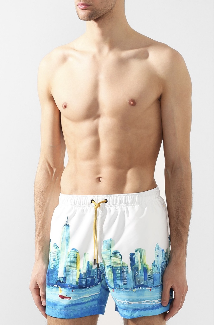 Синие шорты с ярким принтом в виде Нью-йоркского скайлайна зададут правильное летнее настроение. Для создания модели с двумя боковыми карманами использовали тонкий прочный текстиль с шелковистым блеском. Такой материал быстро сохнет, не выцветает в соленой и хлорированной воде. За комфортную посадку здесь отвечает эластичный пояс с кулиской.