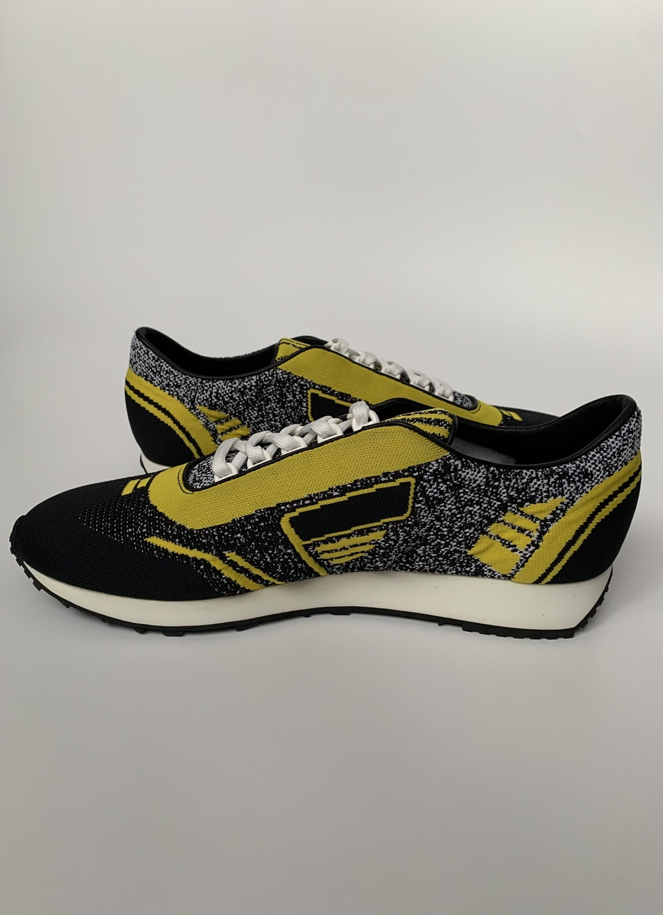 При создании мужских коллекций дизайнеры PRADA фокусируются на моделях,которые никогда не выходят из моды,но при этом всегда остаются актуальными и вписываются в любой гардероб.Данная обувь-не исключение.Это сочетание технологичных материалов,мастерского пошива и богатой цветовой палитры.Яркий пример-в равной степени элегантные и комфортные кроссовки на шнуровке чёрного,серого и жёлтого цвета.Они имеют закруглённый носок,шнуровку спереди,логотип снаружи,стиль колор-блок,стельку с логотипом и плоскую резиновую подошву.