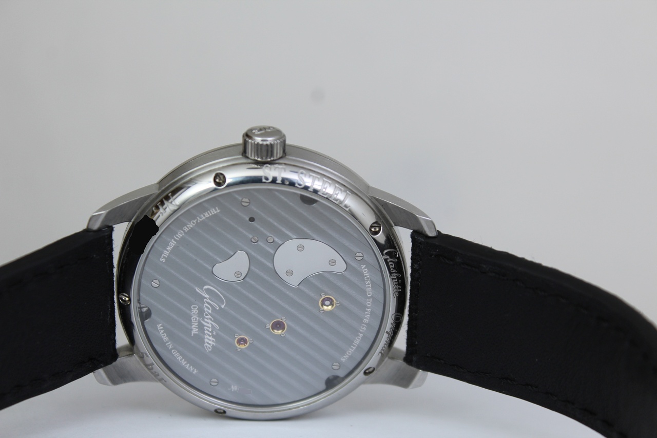 Состояние часов отличное, куплен оригинальный ремешок Glashütte Original из кожи аллигатора (тот же самый, на котором часы идут при покупке в бутике). В октябре 2024 года часы были отполированы в Евротайме - единственном оставшемся в России авторизованном сервисном центре Glashütte Original, не считая основного сервисного центра Swatch Group. Поэтому при полировке использовалось сертифицированное оборудование и применялись стандарты фабрики. За небольшой период после полировки (часы мной носились редко, использовались в основном в формате костюмников) появилась небольшая "паутинка", но не более. В общем, полноценное АА и даже почти ААА.