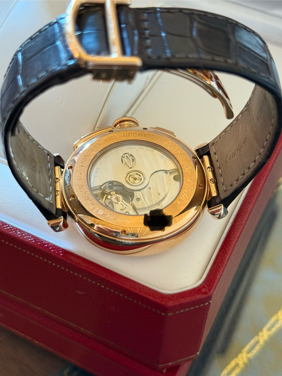 В продаже хронограф Cartier De Pasha 42 mm. Состояние отличное, репассаж в 24 году в мастерской Германа Полосина. Корпус и бакля - розовое золото, оригинальный ремешок из кожи аллигатора.