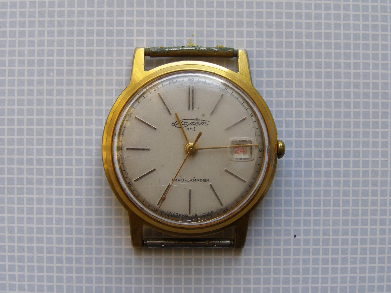 Вот такие часы нашел. Предполагаю, что выпуска 60-х годов. С линзой для календаря. Заезженные в хвост и гриву - ибо из постоянно брали в поход, на картошку и т.п.