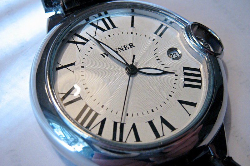 Купил себе эту прелесть, примерно за 25 долларов США. Выглядят неплохо, внутри естественно Китай (снаружи соответственно тоже), хотя не открывал пока - ручки дрожат, говорят у китайцев на винтиках задней крышки сталь мягче, чем наша Ст.3. Скорее всего традиционный механизм для дешевых фейков. Задняя крышка металлическая, с надписями "water resistant" и "all stainless steel". На заводной головке синяя нашлепка, а-ля сапфировый кабошон, но не пластик, т.к. твердая, ножом не царапается.
