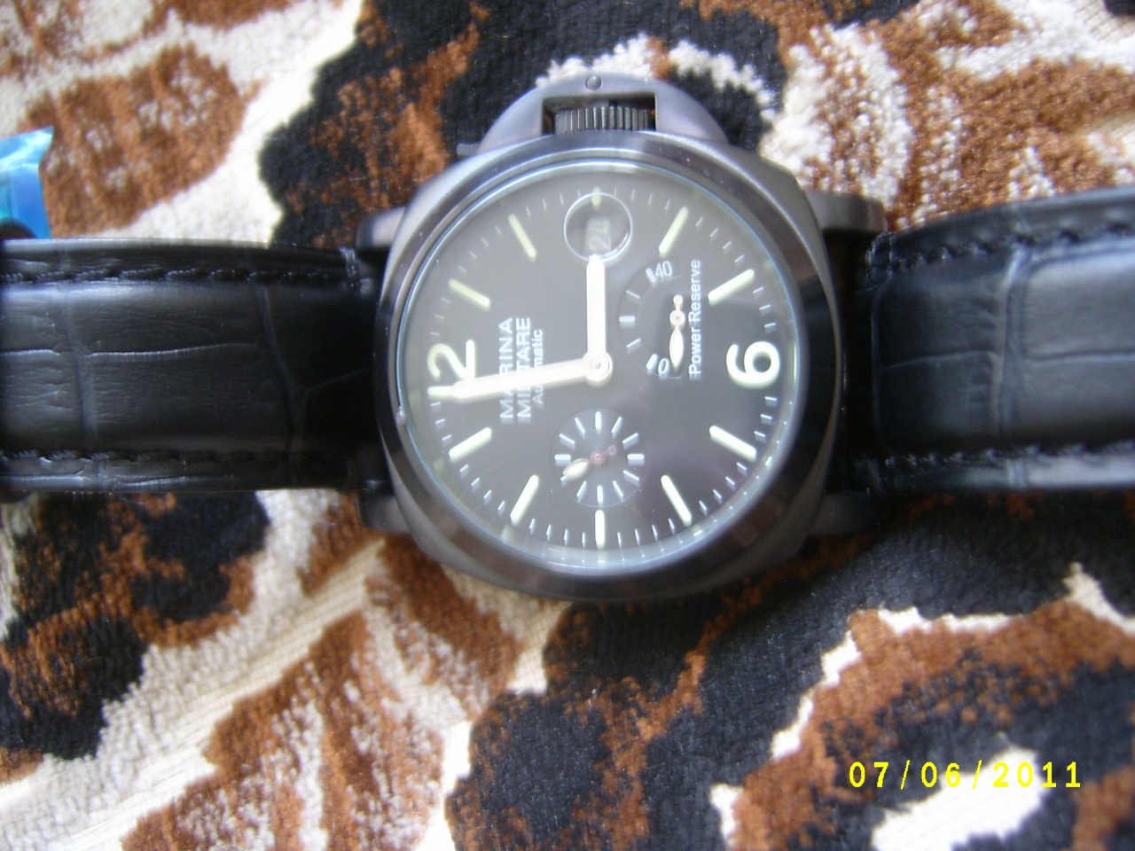 Ну вот и пришла посылка. Заказ оплатил 5 мая, пришла посылка 7 июня. Фото, конечно, получились ужасные, позже попробую лучше сделать. Часы 57 мм-сэндвич, черные стрелки, суперлюмина, ремешок Sandy Brown, минеральное стекло. Часы 44 мм в черном корпусе, золотые стрелки, стекло сапфир, стандартный ремешок с раскладной застежкой. За все про все с пересылкой $ 250. С ходу не убивайте, сам мечтаю о ПАМах, но и костюма от Валентино у меня тоже нет, так что, в фирменной телогрейке ходить? Раньше тоже начинал с убитых жигулей, сейчас на япошке езжу. А эти девайсы понравились, бог даст за пару лет накоплю на 000 ПАМ...