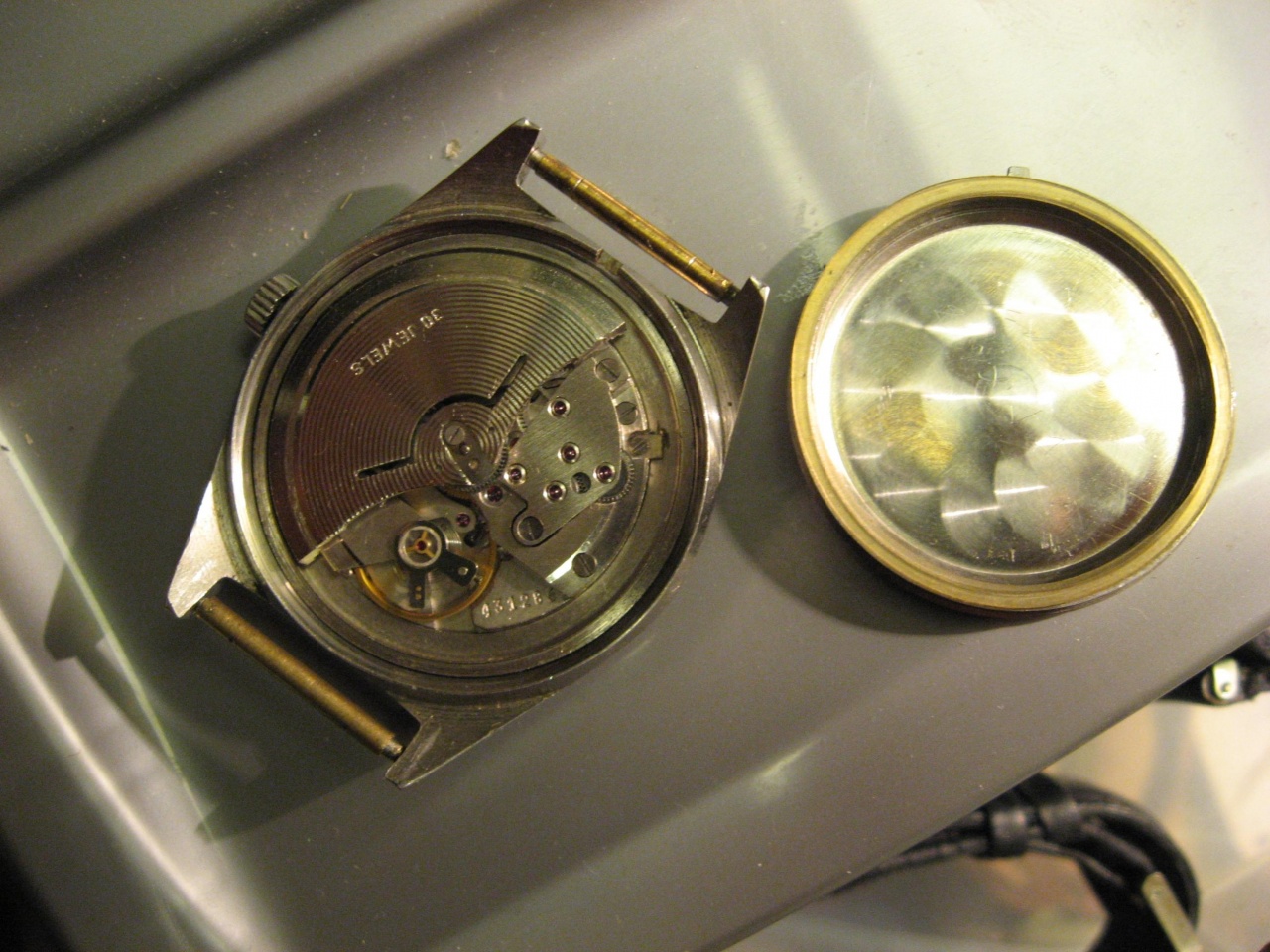 Изначально он был в корпусе с "ножками", но одна была погнута от удара, при поытке выпрямить ее, я ее сломал, часы в таком виде валялись лет 5, нигде не мог найти родной корпус. И вот наконец за 350 руб нашел массивный позолоченный, не ахти как нравится, но лучше чем ничего