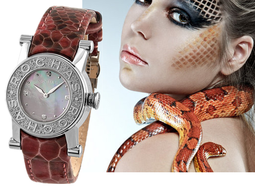 Часовую индустрию "змеиная" мода, конечно, тоже не обошла стороной. Часы со змеиным принтом вы можете найти в коллекциях Roberto Cavalli, Valentino, Givenchy, Jennifer Lopez, Michael Kors, Armani и др. Но среди новинок этого сезона хочется отметить коллекцию "змеиных" часов марки Rochas. Роскошный дизайн этих часов не оставит равнодушными даже самых консервативных барышень. "Великая женская элегантность соединенная с изысканной простотой" - вот она, мечта Марселя Роша, главы дома Rochas. Она полностью воплотилась в этих часах. Ремешки из натуральной кожи, стилизованной под змеиную, перламутровые циферблаты и "верх блаженства" – инкрустация бриллиантами!