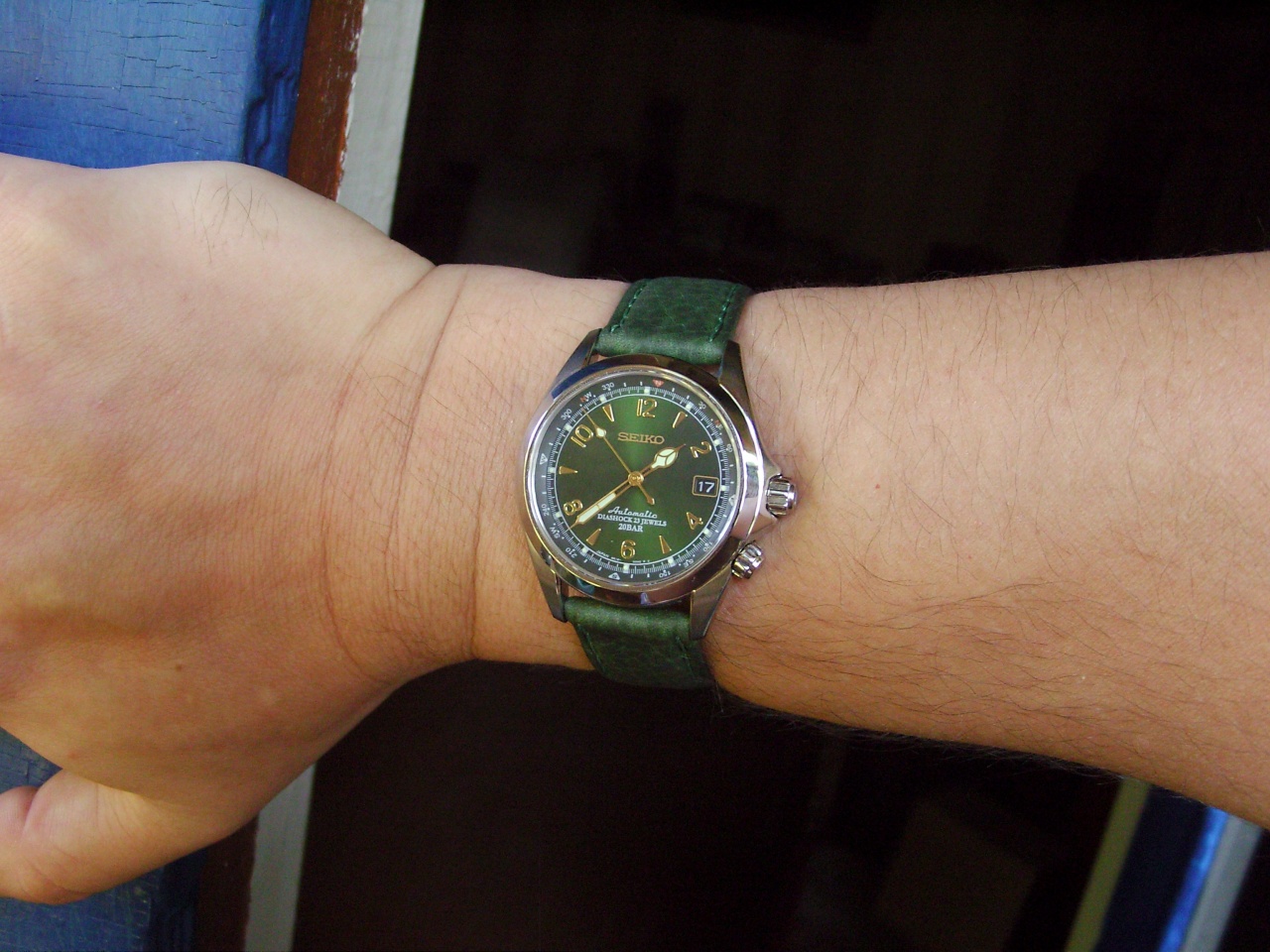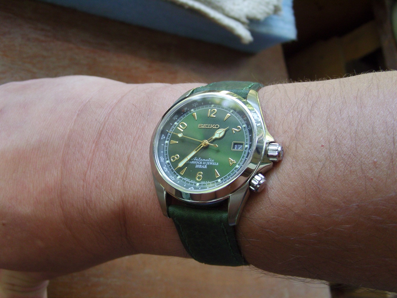 Не скрою, когда просматривал все страницы, посвященные предмету нашего общего обожания и поклонения, надеялся найти альтернативный коричневому ремень, который бы мог составить хоть какую-то конкуренцию априорно коричнево-зеленому сочетанию. Не могу сказать, что вариантов было очень много, поэтому пришлось напрячь остатки воображения, совершить этакий brainstorm, дабы представить, как может выглядеть то, что мне понравится, после чего, продолжая нещадно потеть мозгами, начал просматривать многочисленные предложения кожевенных тюнингистов и продавцов. На одном очень известном и популярном сайте начали попадаться интересные варианты, снаряды падали все ближе, пока не обнаружилось несколько вариантов и, после вдумчивого, хотя и во многом умозрительного выбирания, осталось два (зеленых) - блестяяяяшшшая змеиная красота (все же отвергнутая из-за чрезмерной блестяшшшести, инда в глазах рябило - но зеленая, пакость!) и тот вариант, на котором решил остановиться. Матовая кожа, с тиснением, прострочена зеленой нитью, СПОКОЙНЫЙ зеленый цвет, кмк, вполне сочетающийся с циферблатом Альпа и дополняющий его, как и наоборот. Померив его с родной баклей, решил прикинуть заказанную там же бабочку (матовую - прекрасно подошла к матовым частям часов, да и царапки меньше видны), после чего, удовлетворенный, устало расслабился.