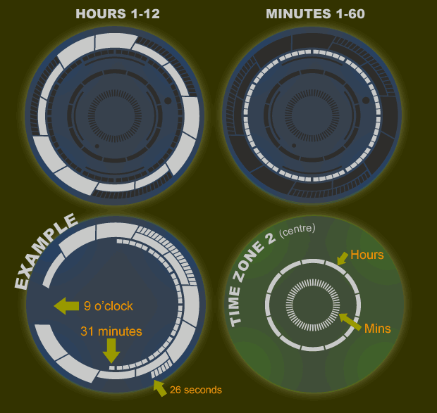 Как всегда Tokyoflash постарались начудить с циферблатом, чтоб владельцы первое время ломали голову, как определить время. Текущее время можно узнать по трем внешним кругам, внешний круг с большими рисками отдали часам, внутренний размеченный квадратиками минутам, а мелкие бегущие вставки между большими рисками это секунды. Придется помучатся несколько дней пока привыкнете быстро быстро определять время. Внутри циферблата ближе к центру разместили два круга, на котором показывают точное время второго часового пояса. Дисплей сделали монохромным со светодиодной подсветкой, получилось довольно оригинально.