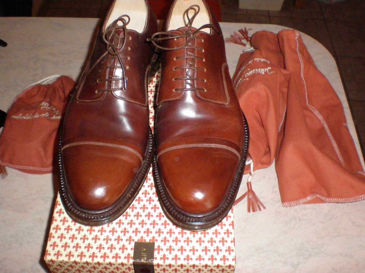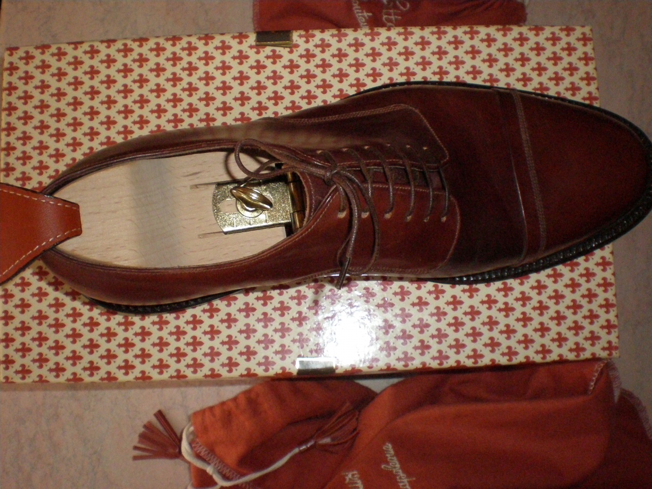 Туфли не ношены (размер 9,1/2 или 43,5 ) ,только пару раз примерял на дому , но так и не нашёл в гардеробе своём ни часы ни одежду под эти дорогие , красивые и качественные шузы ручной работы. В комплекте прилагаю деревянные регулируемые колодки , резиновую профилактику от Vibram , крем для обуви , запасные набойки на каблук и запасные шнурки .