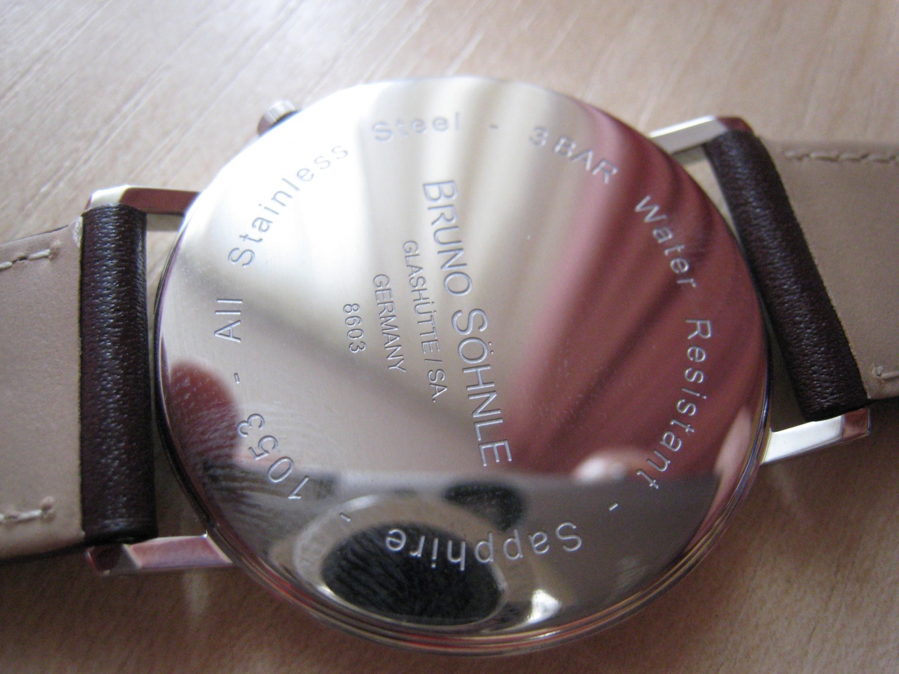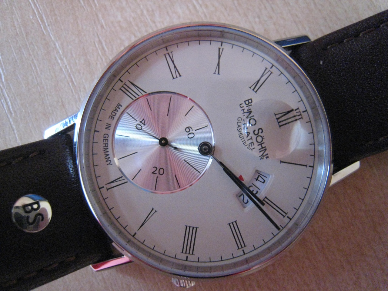 Но эти сразу бросились в глаза. Я даже не знаю точно чем они привлекли моё внимание. То ли строгостью и завершённостью своей формы, то ли циферблатом цвета слоновой кости, то ли римскими цифрами так любимыми мною, то ли часовой и минутной стрелками которые сделаны таким образом, что при мимолетном взгляде на часы кажется, буд-то бы они парят над циферблатом. А может привлекла внимание вынесенная на отдельный гильошированный серебристый циферблат секундная стрелка? Или многочисленные напоминания, видимо для тех, кто перебрал абсента после которого возможна кратковременная потеря памяти о производителе данных часов. Две первых буквы ВS названия нанесены и на заводную головку,и на ремень. Полное название выбито на застежке ремня, на задней крышке часов и с обратной стороны ремня. А может всё-таки сделанная довольно крупными буквами надпись MADE IN GERMANY? Но скорее всего совокупностью всех вышеперечисленных качеств. Лаконичность, строгость, изящество. Взяв их в руки, попытался сморщить свои извилины и хоть что-нибудь вспомнить об этом производителе, но у меня так ничего и не получилось, так как отмечалось выше , я никогда не являлся поклонником а тем более любителем немецких часов. Но, приложив их к руке понял, что именно их я и приобрету. Заикнувшись за скидку, получил от немки категоричное «найн». Спорить я не стал. Уже расплачиваясь на кассе догадался спросить что же за механизм установлен в часах. Оказалось_ обычная швейцарская кварцевая «Ронда». А я уж грешным делом подумал, что мануфактура, о чём и спросил у продавца. На что она накнопала на калькуляторе стоимость немецкой мануфактуры, от которой мои глаза увеличились до размеров стекол моих очков. Чуть позже выяснилось, что 20 евро мне все-таки скинули. Тем же вечером, вернувшись в Прагу, решил провести эксперимент о котором неоднократно упоминалось на форуме где с помощью капли воды проверяется сапфировое стекло или нет. Во избежании обвинения в манипуляциях с каплей фото данного эксперимента прилагаются. На первой фотографии капелька находится в верхней части стекла, на второй же, та-же капелька не растекаясь мыслью по древу, переместилась уже в нижнюю часть циферблата. Ну и по доброй традиции этого форума так же прилагаются фото часов на руке и без руки. А как-же Сейко и Ориент? Придет время и они все-таки появятся у меня, но это уже будет совсем другая история.
